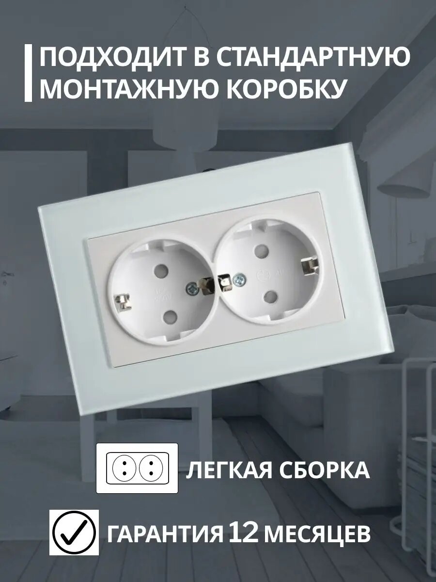 Розетка Stekker "Катрин", двойная, белая, с заземлением и шторками, стекло информация: