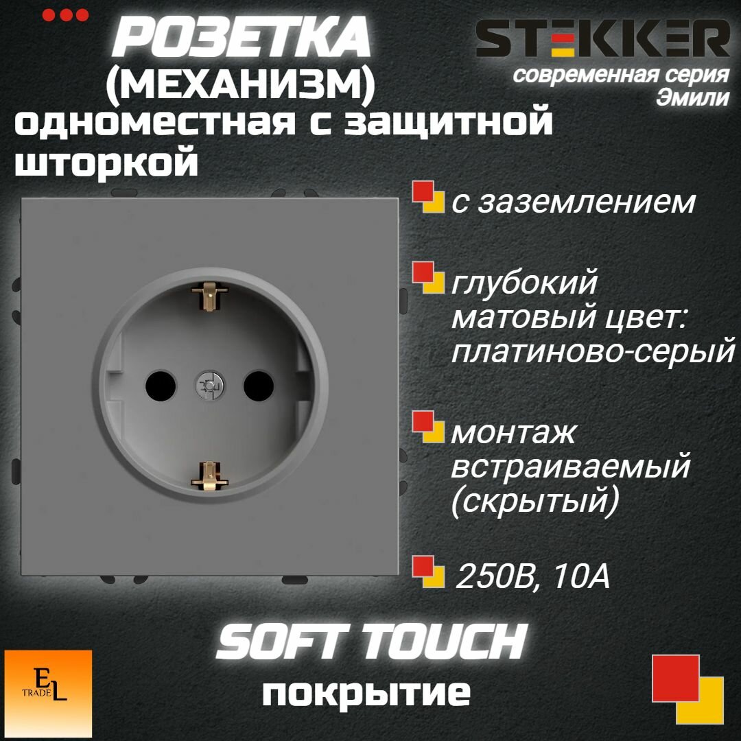 Розетка одноместная с защитной шторкой с заземление (механизм), 250В, 16А, серия Эмили, платиново-серый, soft touch, 71х71х71 мм, Stekker 49958 информация: