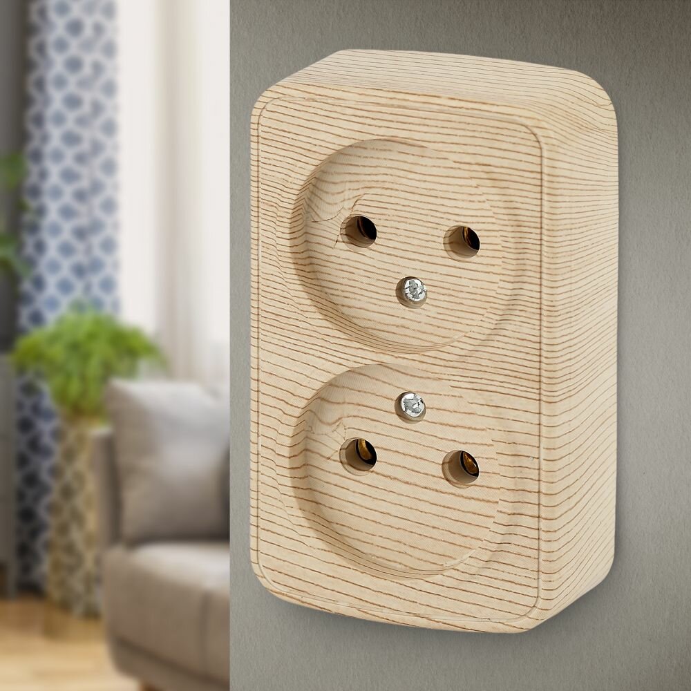 Розетка Intro Polo 3-203-11 двойная без заземления 2х2P 16A-250В IP20 открытой установки сосна информация: