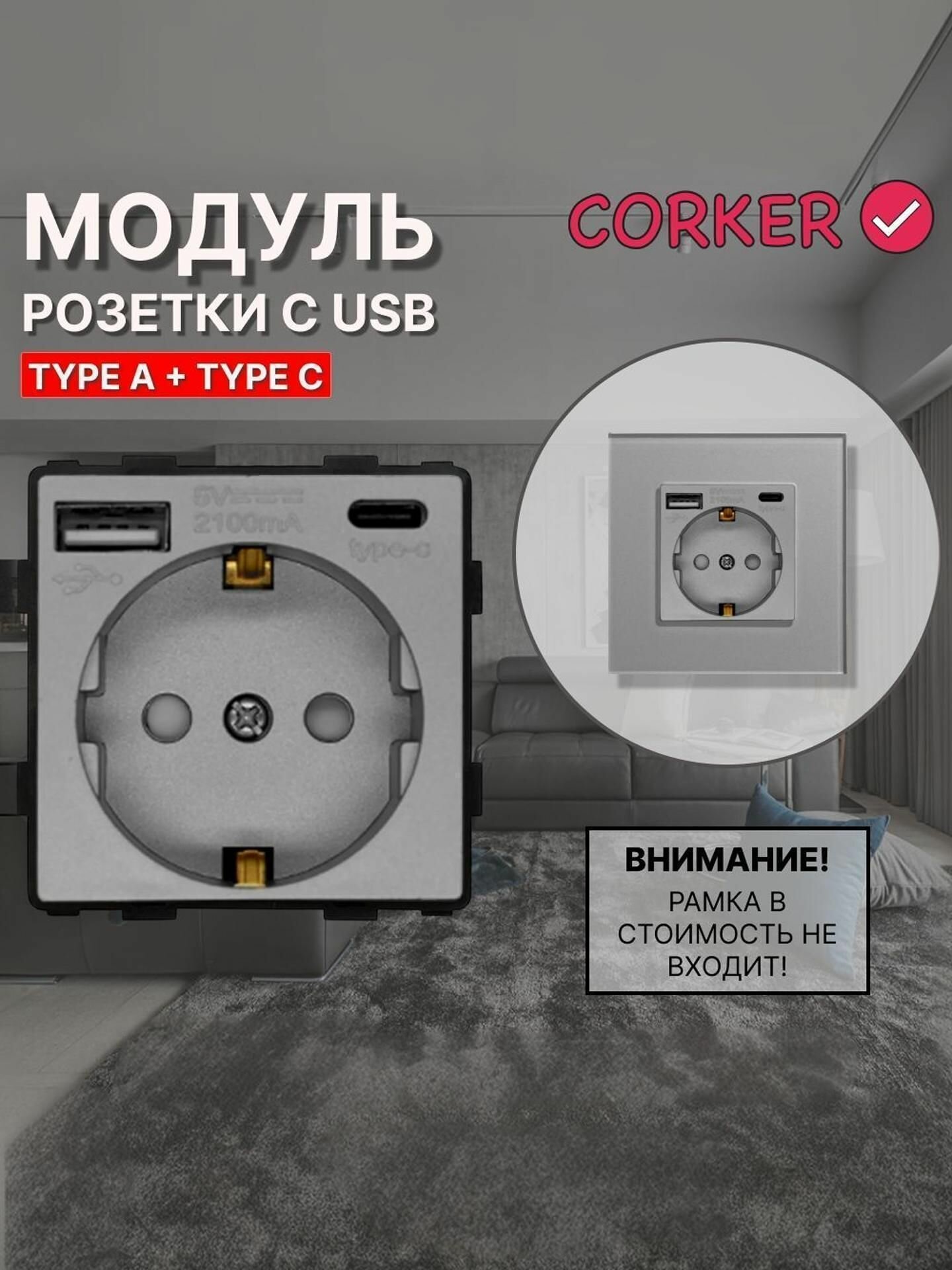 10 цен на Розетка CORKER с USB и Type-C (A+C ) с заземлением и защитными шторками, без рамки / серая