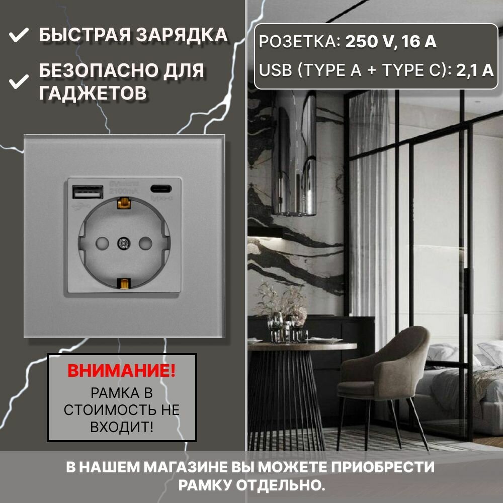 Розетка CORKER с USB и Type-C (A+C ) с заземлением и защитными шторками, без рамки / серая информация: