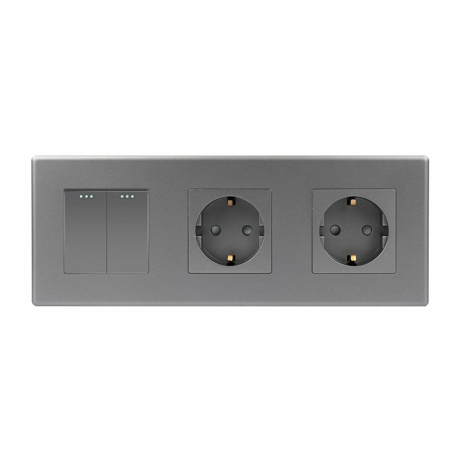 Отзывы на Выключатель с розеткой, 2 клавиши 2 розетки, 3 поста (M2+2F) рамка пластик 228х86мм цвет серый
