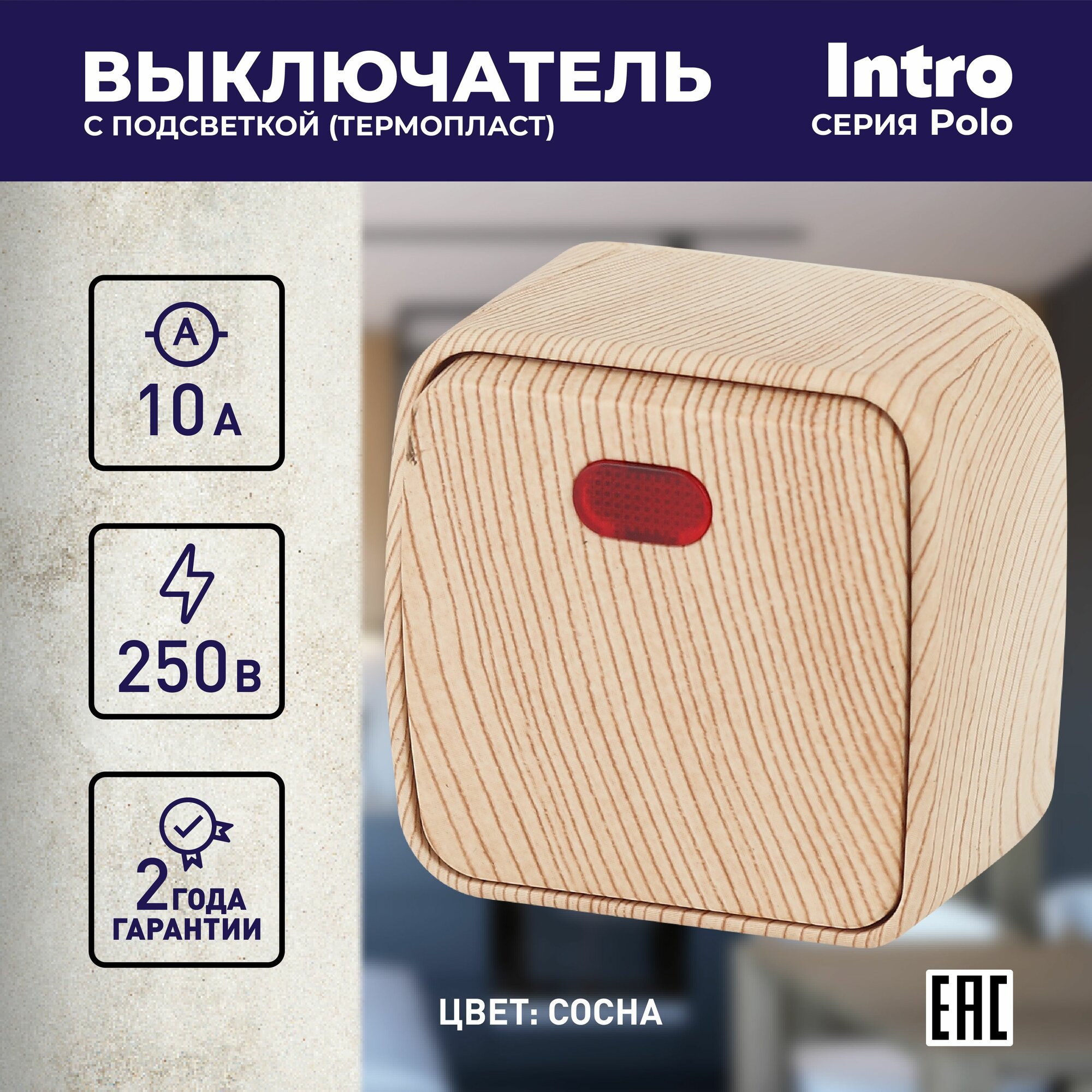 Выключатель одноклавишный Intro Polo 3-102-11 с подсветкой открытой установки 10А 250В сосна информация:
