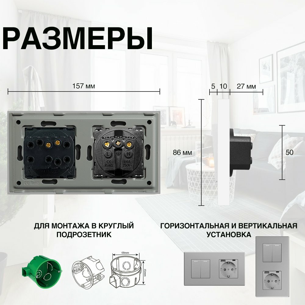 Механический выключатель с розеткой, рамка ABS, 2 поста (1кл.+1роз.) информация:
