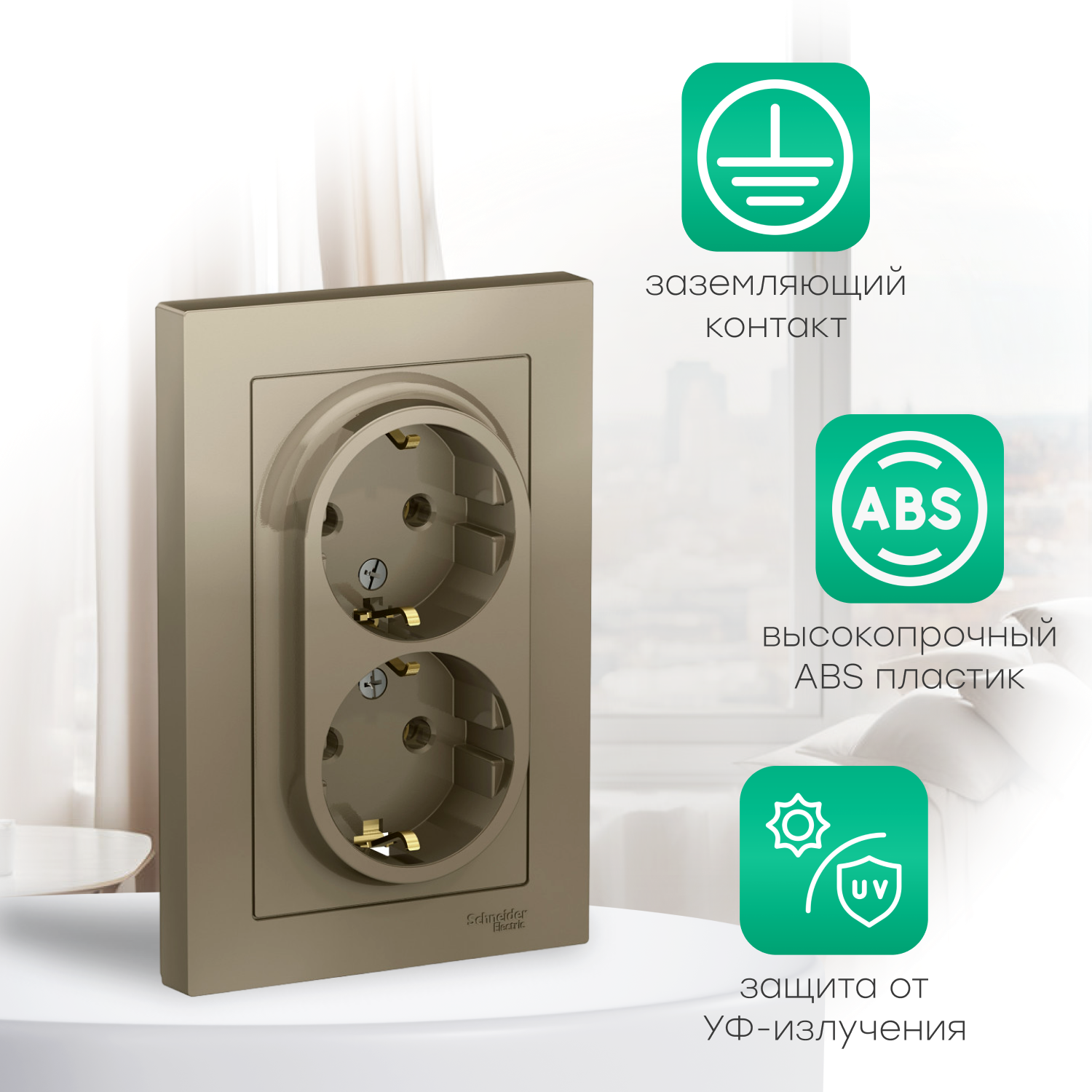 Отзывы на Systeme (Schneider) Electric ATLASDESIGN розетка двойная с заземлением, 16А, в сборе, шампань ATN000524