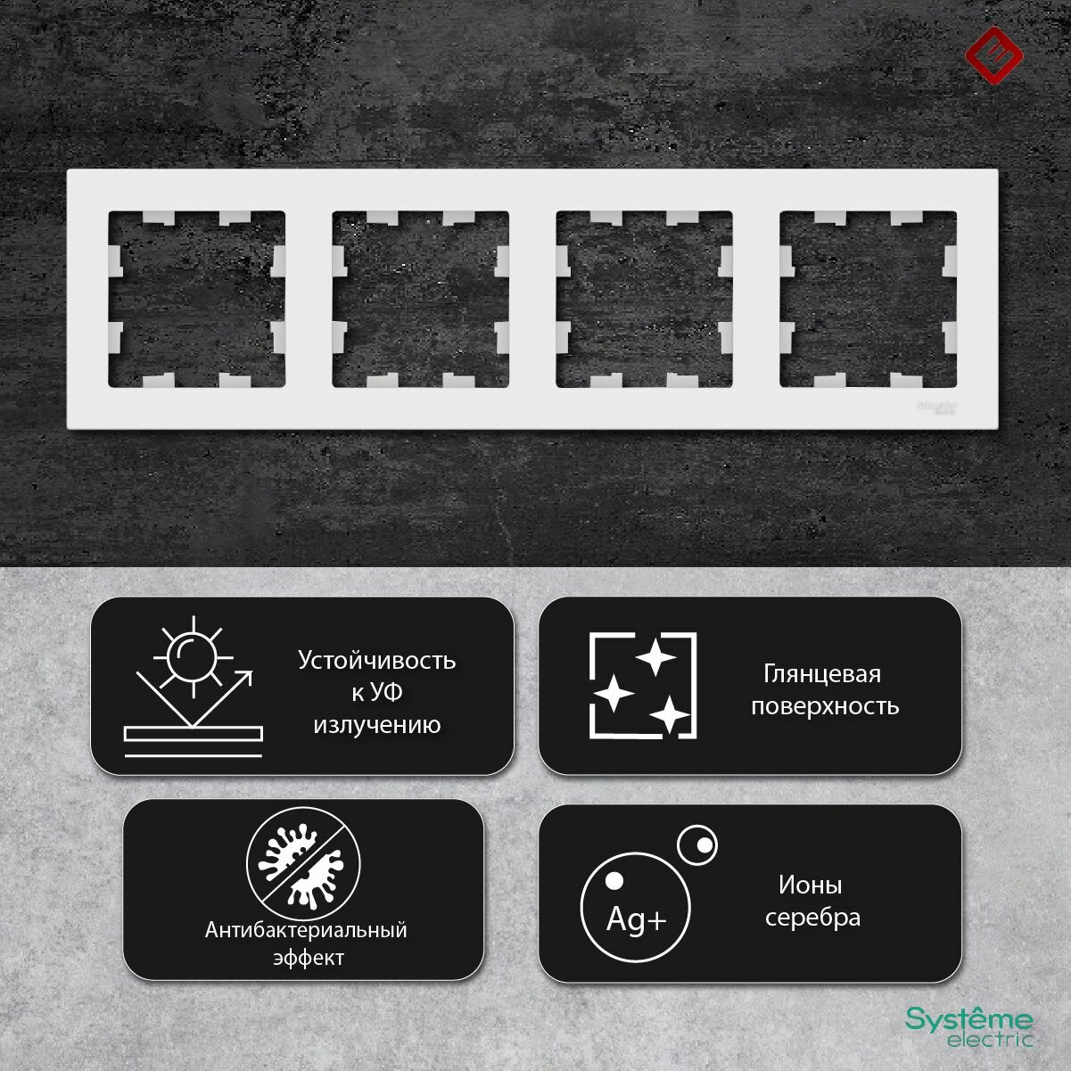 Рамка для розеток и выключателей четырехпостовая (Белый), Schneider Electric AtlasDesign информация: