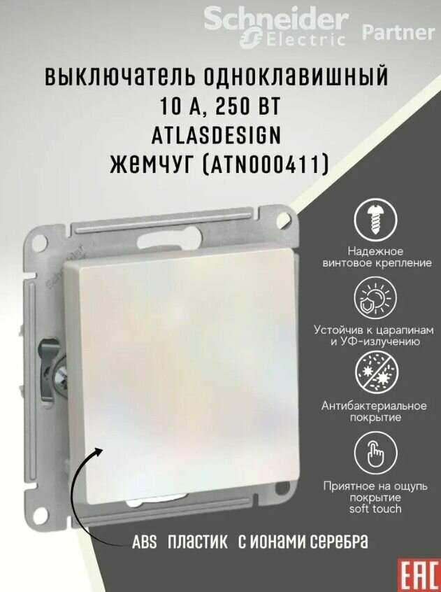 Выключатель одноклавишный 10А, Systeme Electric (Schneider Electric) ATLAS DESIGN, жемчуг (комплект 2 шт) информация: