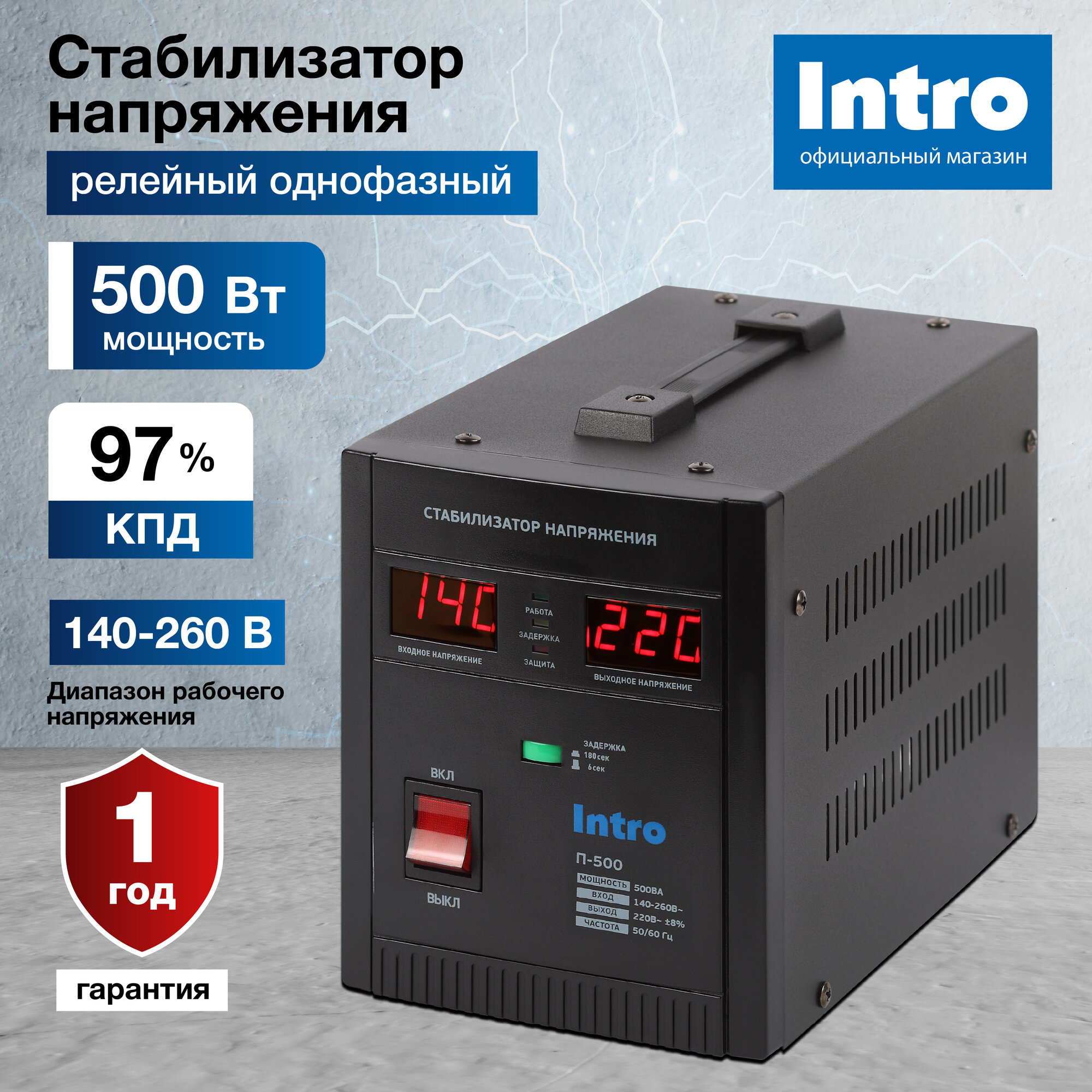 Стабилизатор напряжения 220в Intro П-500 однофазный релейный переносной напольный для газового котла 500ВА, 140-260В информация: