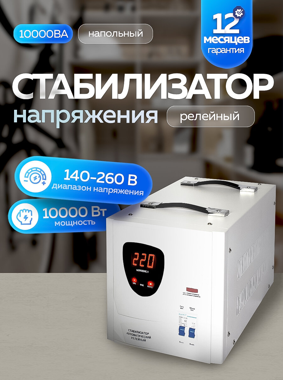 10 цен на Стабилизатор напряжения релейный 10000ВА напольный, однофазный, от переменного напряжения