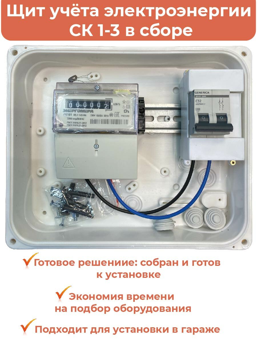 Комплект Гаражный-1Э-32: Щит учёта электроэнергии в сборе СК 1-3: счетчик CE101 R5.1 145 M6, автомат C32 информация: