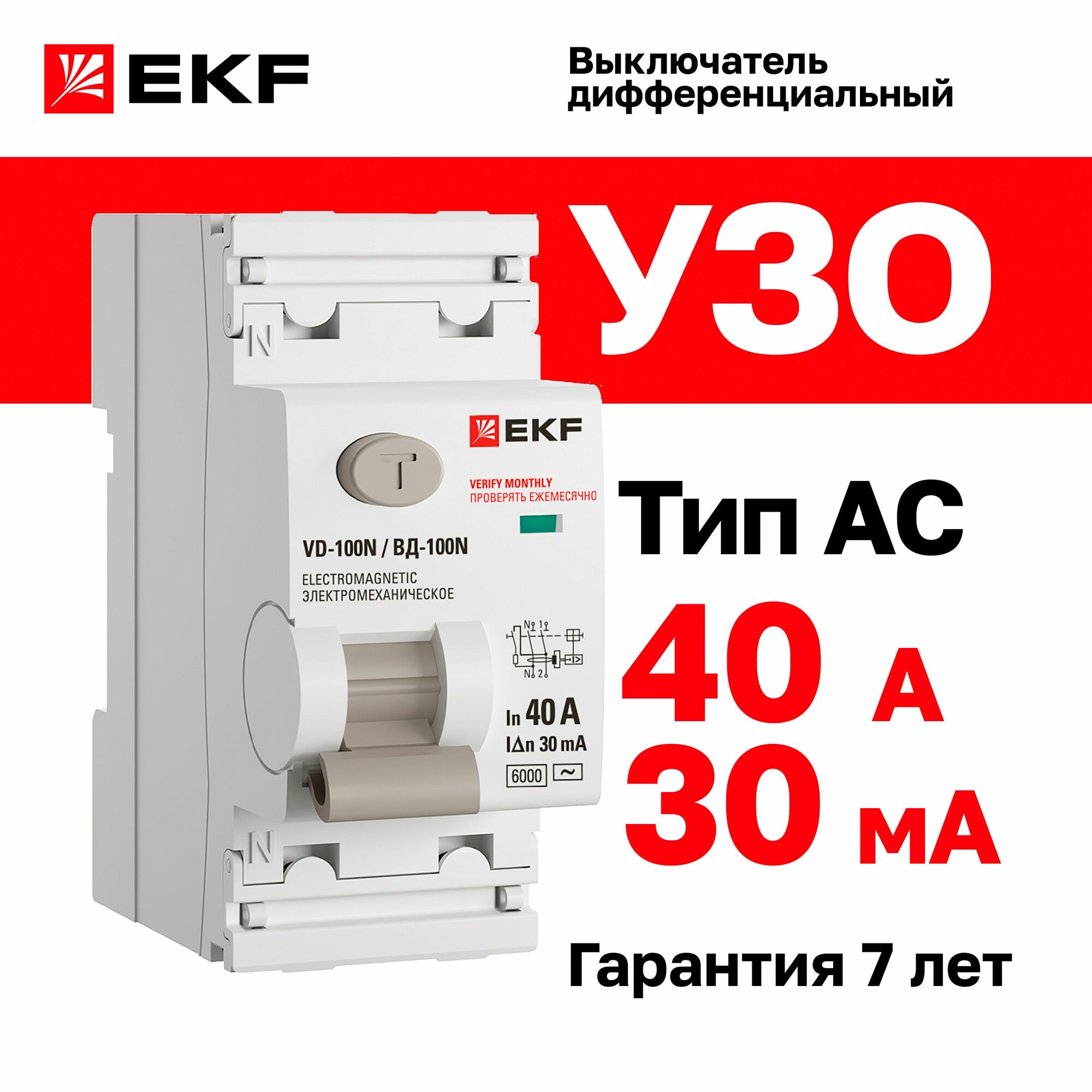 УЗО 40А, ток утечки 30мА, тип AC, двухполюсное 2P, 6кА , EKF PROXIMA ВД-100N дифференциальный выключатель - устройство защитного отключения информация: