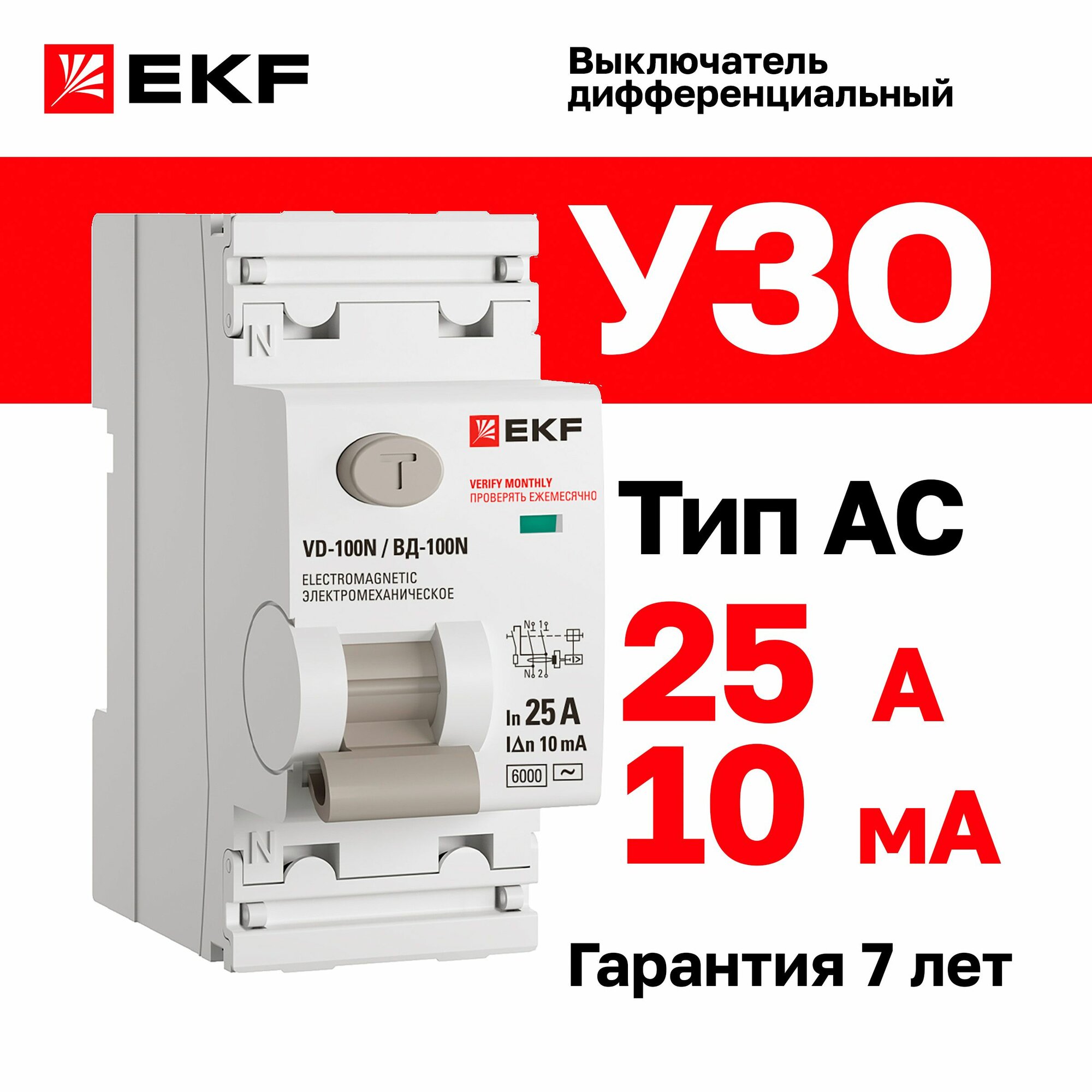УЗО 25А, ток утечки 10мА, тип AC, двухполюсное 2P, 6кА , EKF PROXIMA ВД-100N дифференциальный выключатель - устройство защитного отключения информация: