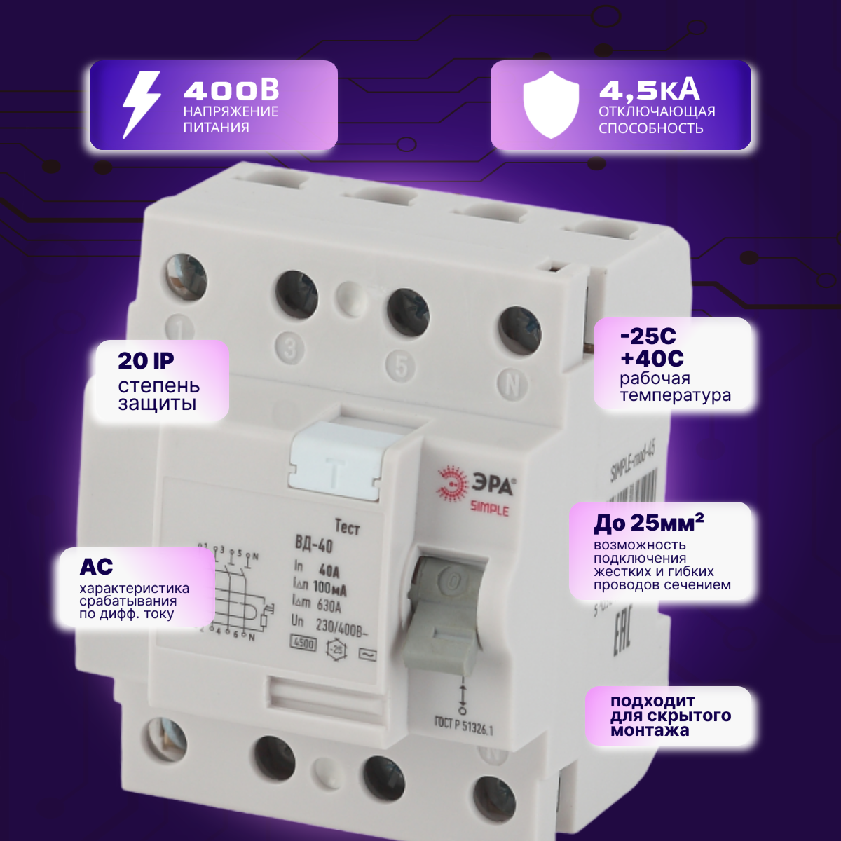 Выключатель диф тока УЗО 4P (4П) 40А 100 мА АС электронное SIMPLE-mod-49 ВД-40 Б0039269 Эра 1шт информация: