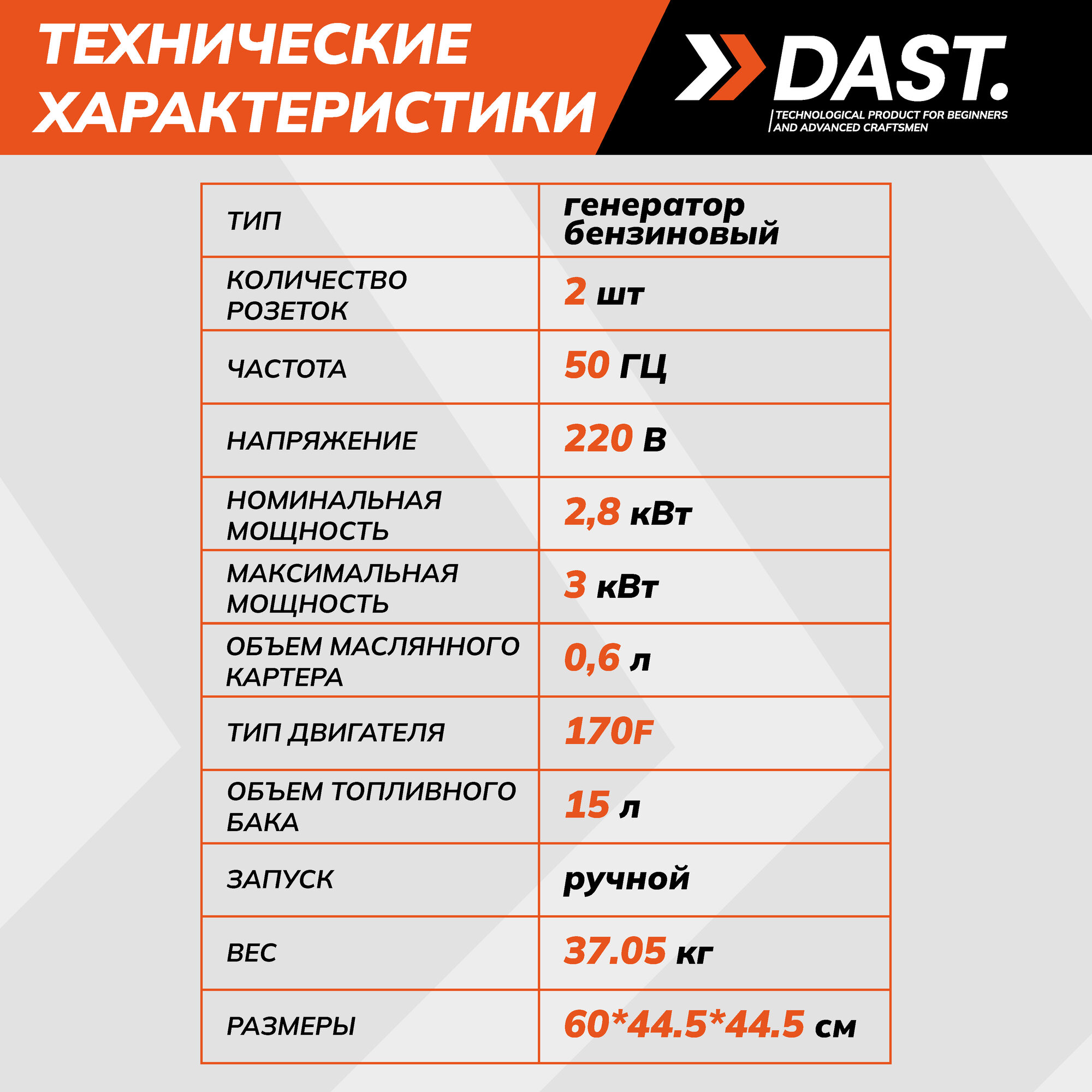 Генератор бензиновый DAST 2.8-3 кВт, 15 л, 2 розетки, клеммы, 4-тактный DGB-4500 информация:
