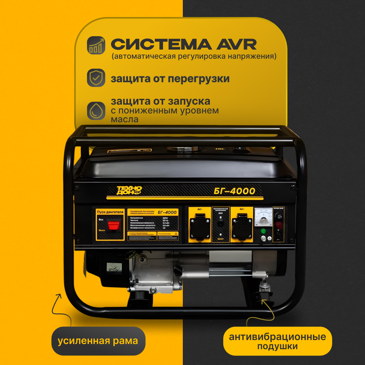 Генератор бензиновый Электрический Техно-Дон БГ-4000 3,2-3,8 кВт, 50 Гц, 7 л. с, 4 тактный двигатель, электростанция для дома информация: