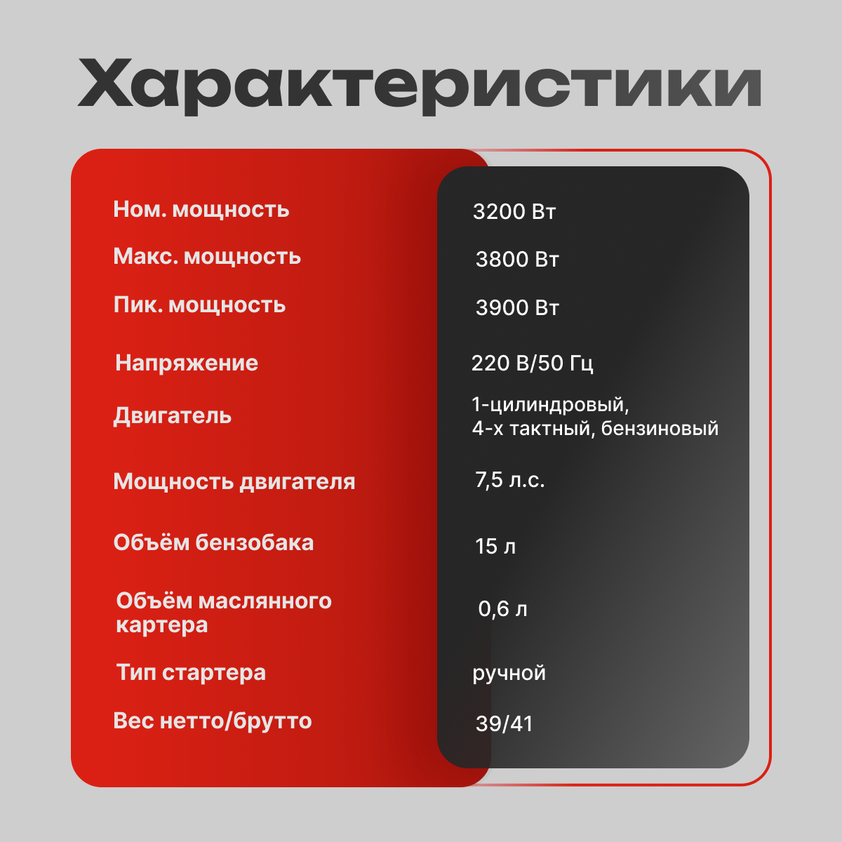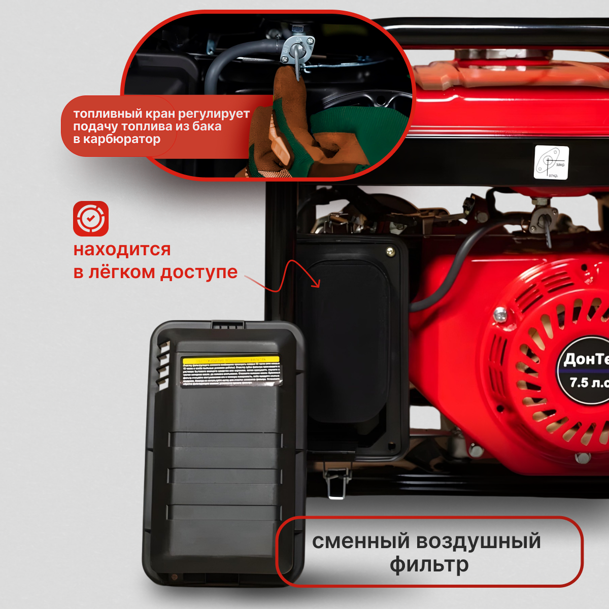Генератор ДонТех Электрический БГ-4000 ( 4.75 кВА, Максимальная нагрузка, 3,2-3,8 кВт, 50 Гц, 7 л. с, 4 тактный двигатель ) информация: