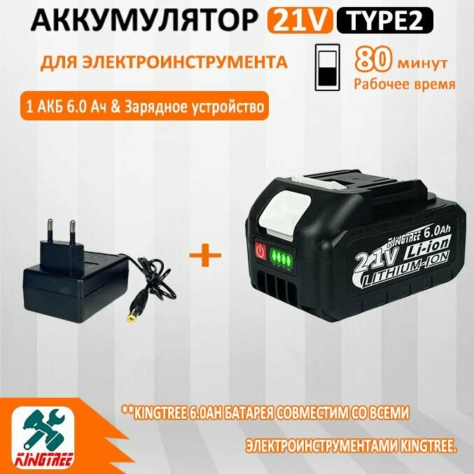 Kingtree Новый 6.0 21V Литий ионный инструмент Аккумулятор,(1 АКБ 6.0Ач & Зарядное устройство) информация: