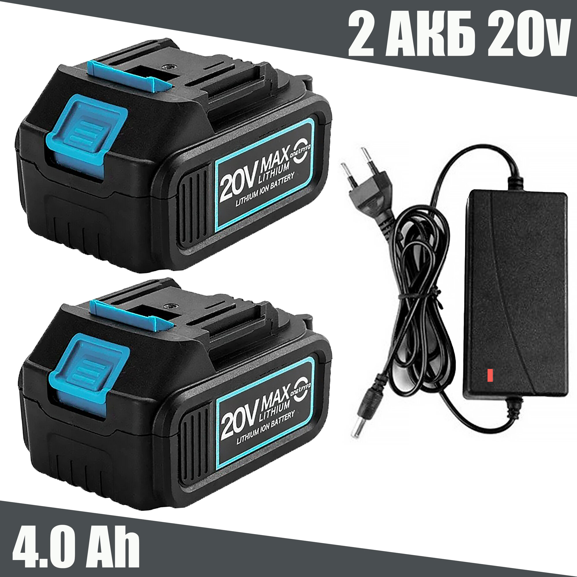 Аккумулятор Батарея 20 вольт 2шт 4.0 Ah MAXLITHIUM и ЗУ для инструмента: шуруповерта, гайковерта, секатора, болгарки информация: