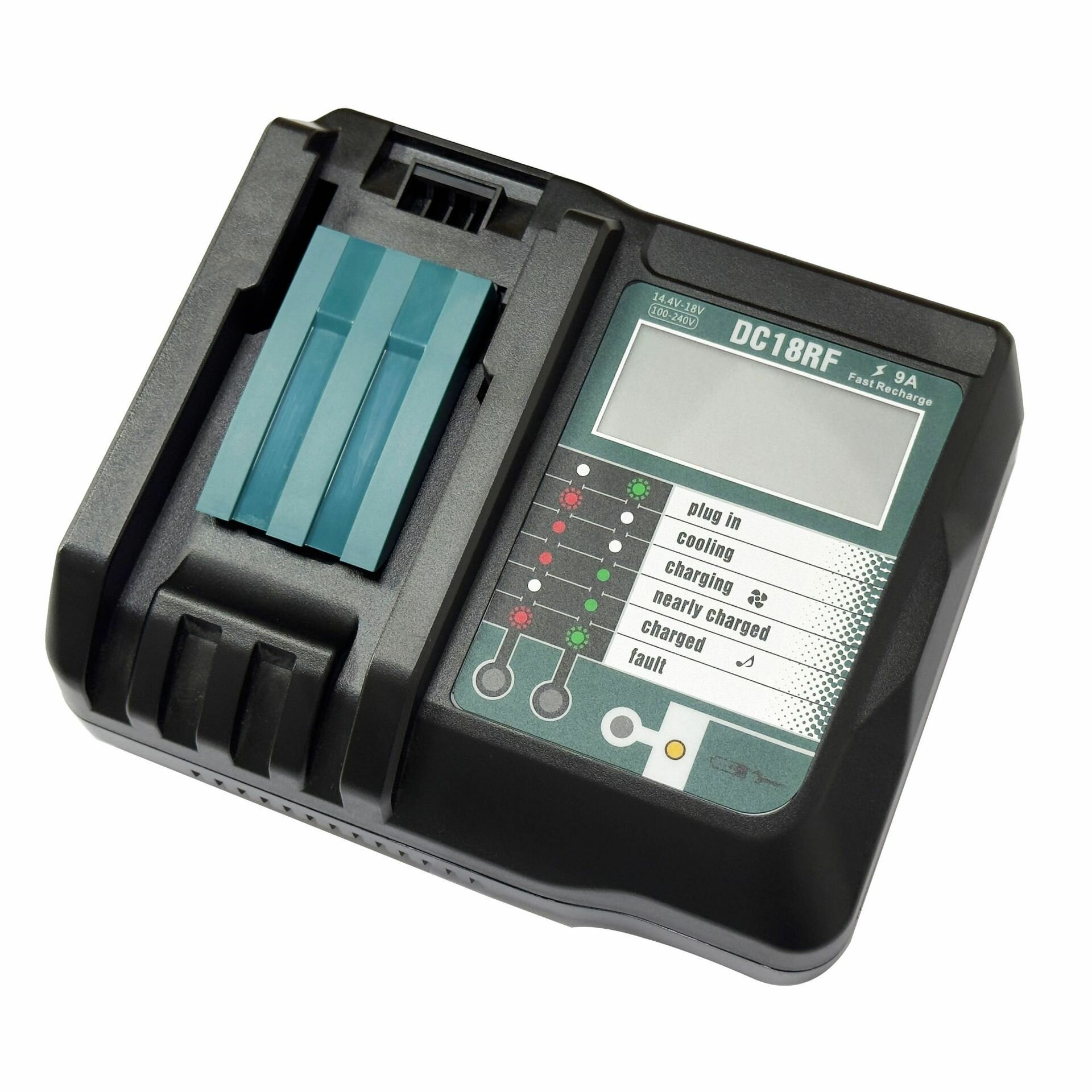DC18RF-9A, однозарядное зарядное устройство с экраном, подходит для зарядного устройства makita14.4V-18V для литиевых аккумуляторов (встроенные 2 охлаждающих вентилятора) информация: