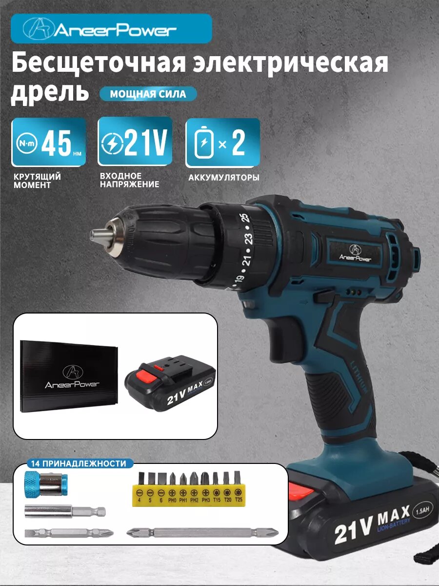 Шуруповерт AneerPower, 21 В, ударный, аккумуляторный, с 2 аккумуляторами и зарядкой+14 мелких аксессуаров. информация: