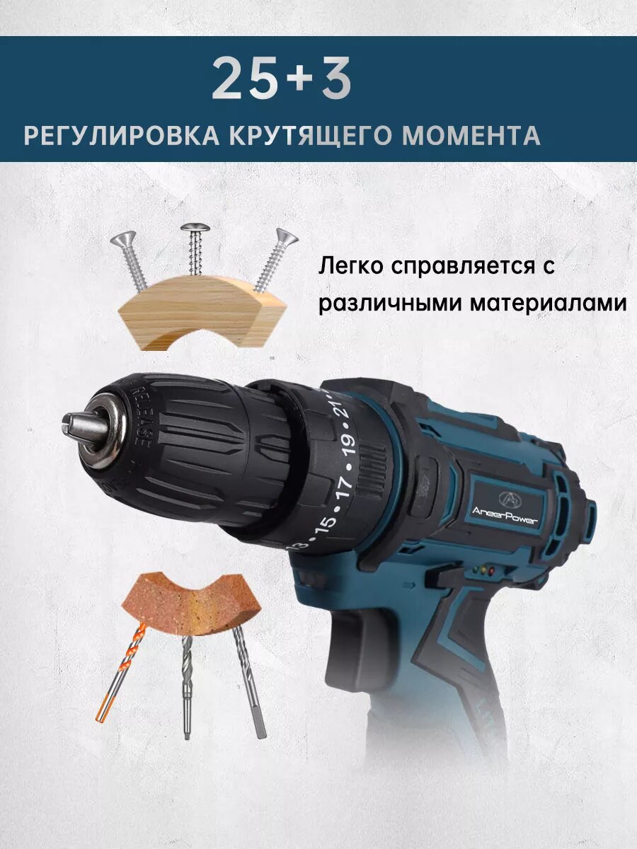 Отзывы на Шуруповерт AneerPower, 21 В, ударный, аккумуляторный, с 2 аккумуляторами и зарядкой+14 мелких аксессуаров.