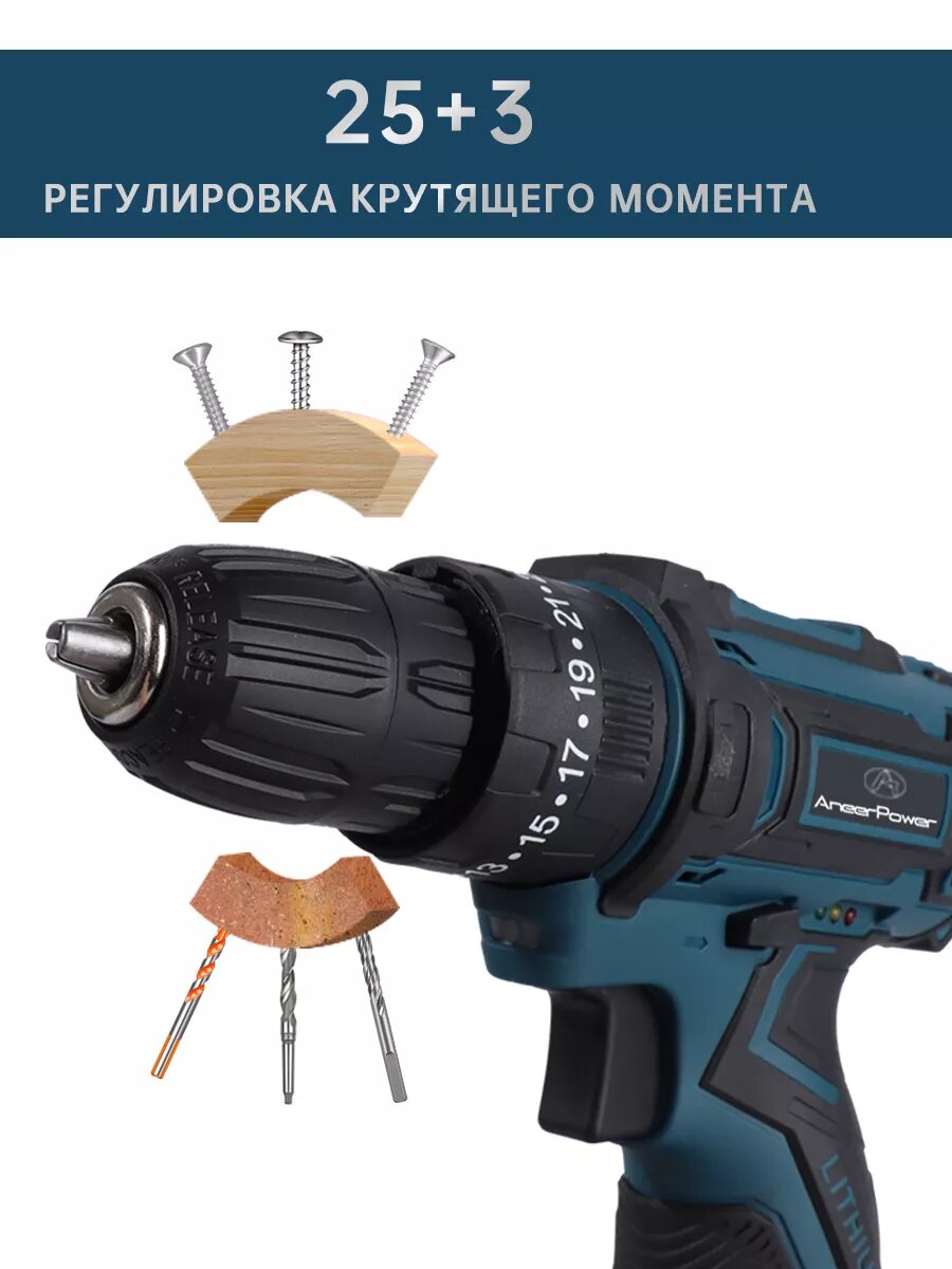 10 цен на Шуруповерт AneerPower 12В, ударный, аккумуляторный, бесщеточный+1 аккумулятор +14 аксессуаров.