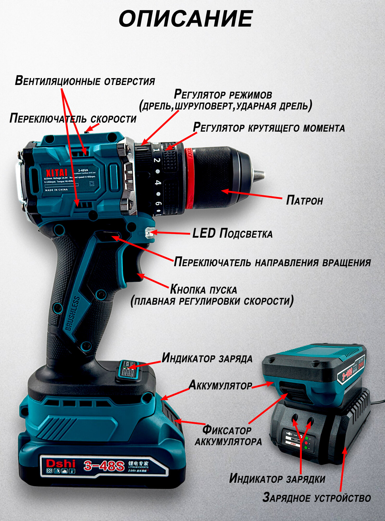 Дрель-шуруповерт аккумуляторная DSHI(XITAI)21В, 2АКБ, бесщеточная, ударная информация: