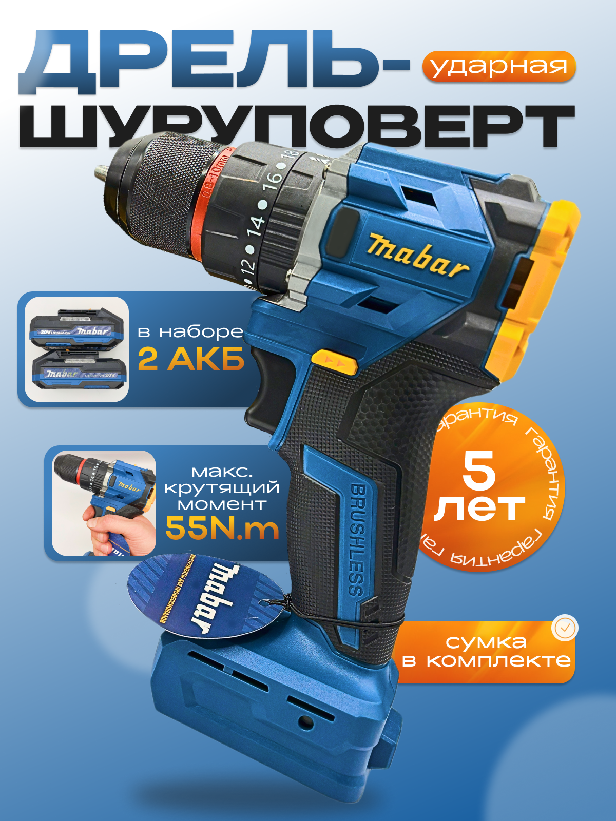 Дрель-шуруповёрт Mabar, ударный, бесщёточный, 2 аккумулятора, 20В информация: