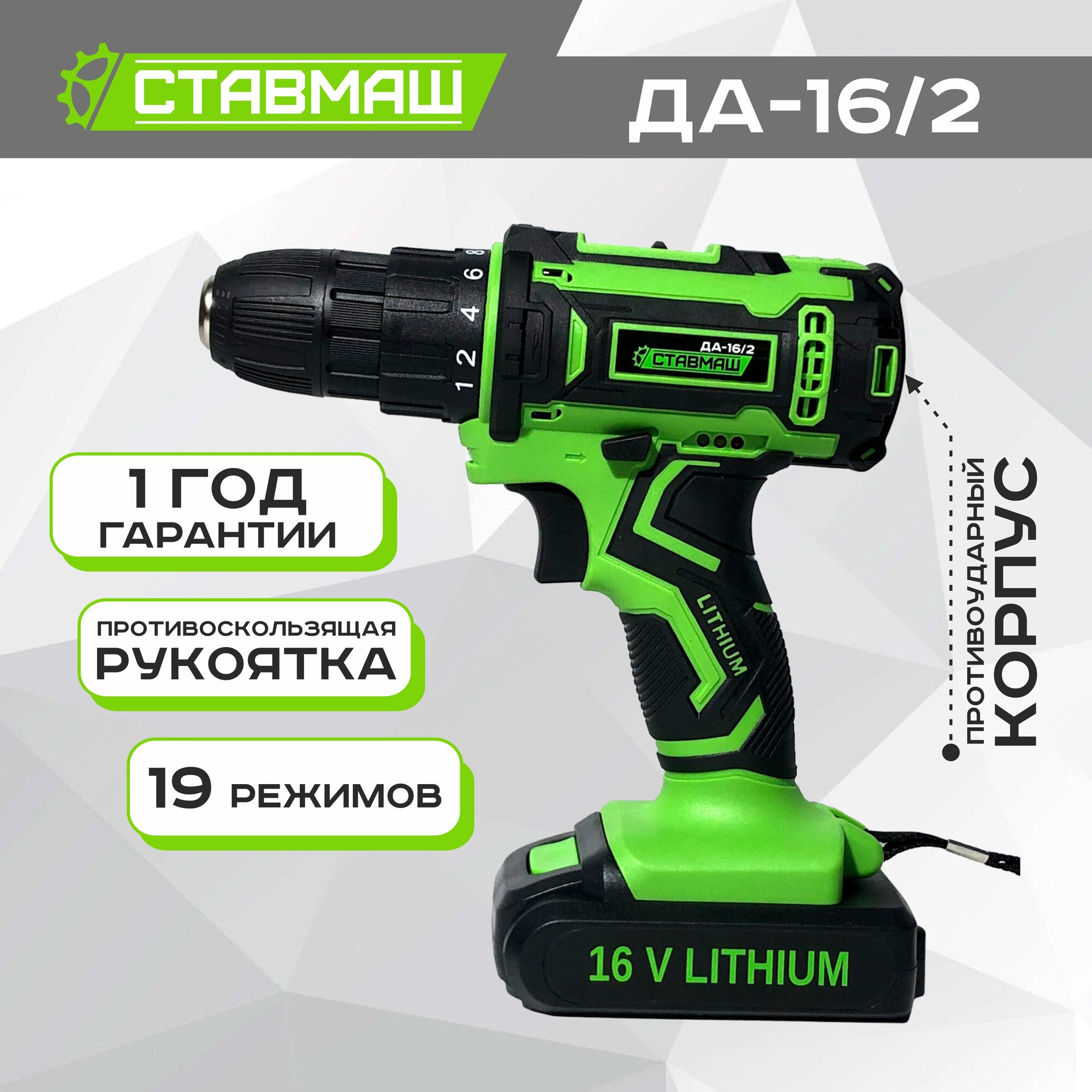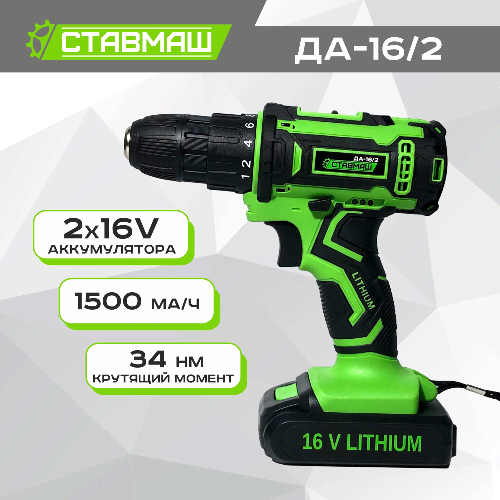 Дрель-шуруповёрт Ставмаш ДА-16/2, две скорости, 16В, 34 Нм, с кейсом информация: