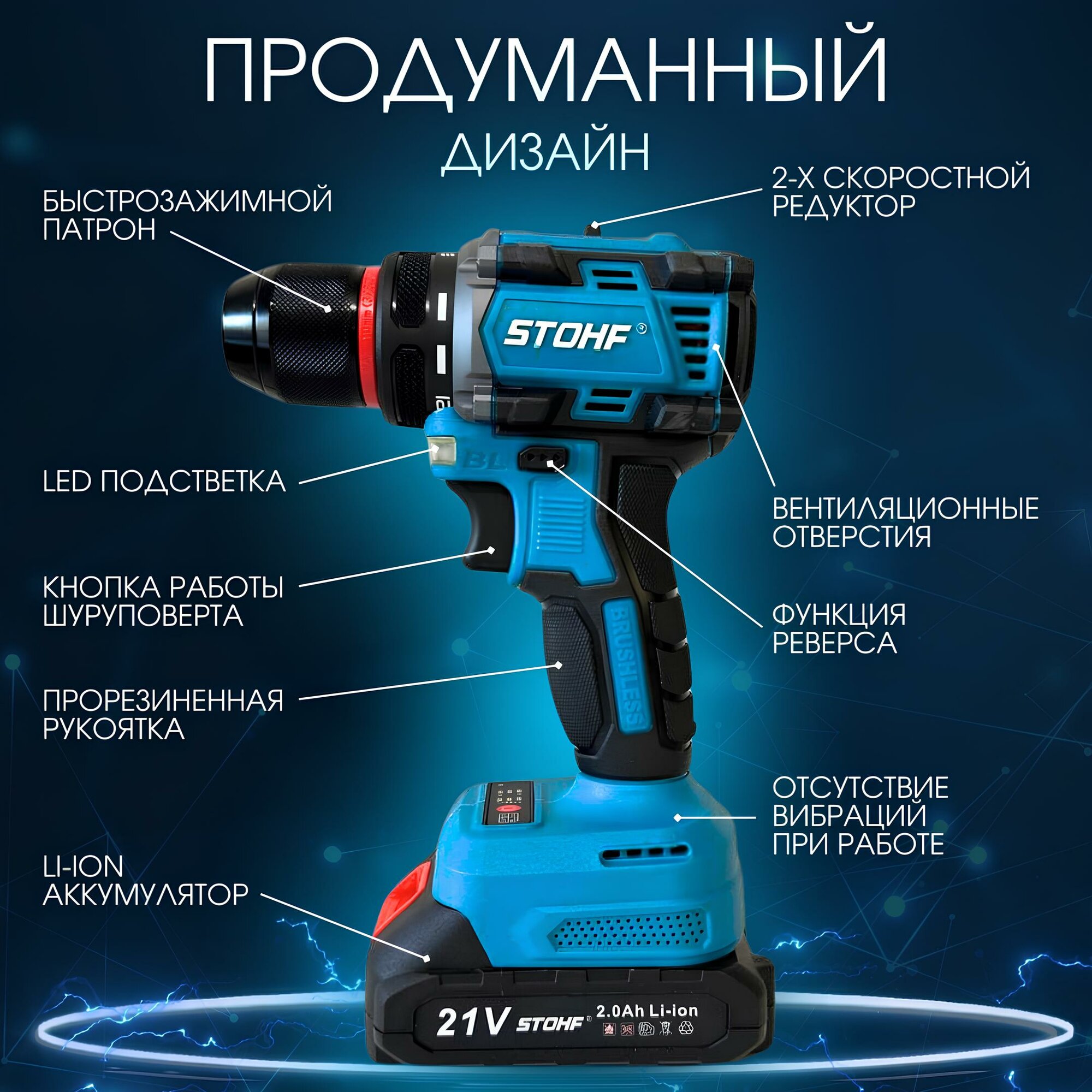 Аккумуляторный шуруповерт STOHF, бесщеточный, защита от перегрузок информация: