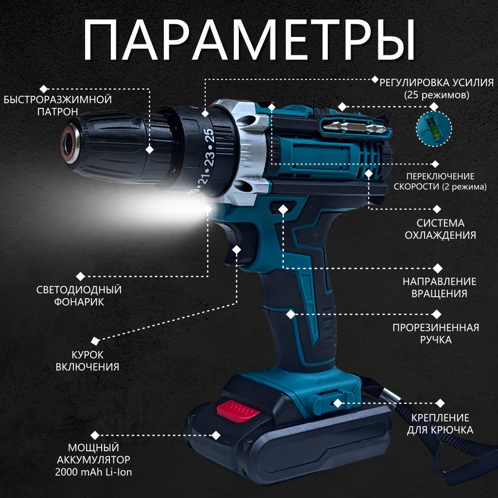 Отзывы на Дрель-шуруповерт аккумуляторный, 21 В, 2 АКБ, кейс, Синий (комплект, набор инструментов)