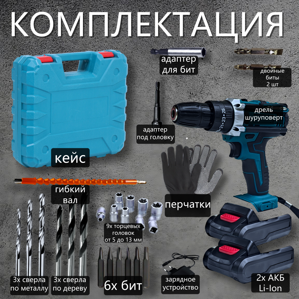 Дрель-шуруповерт аккумуляторный, 21 В, 2 АКБ, кейс, Синий (комплект, набор инструментов) информация: