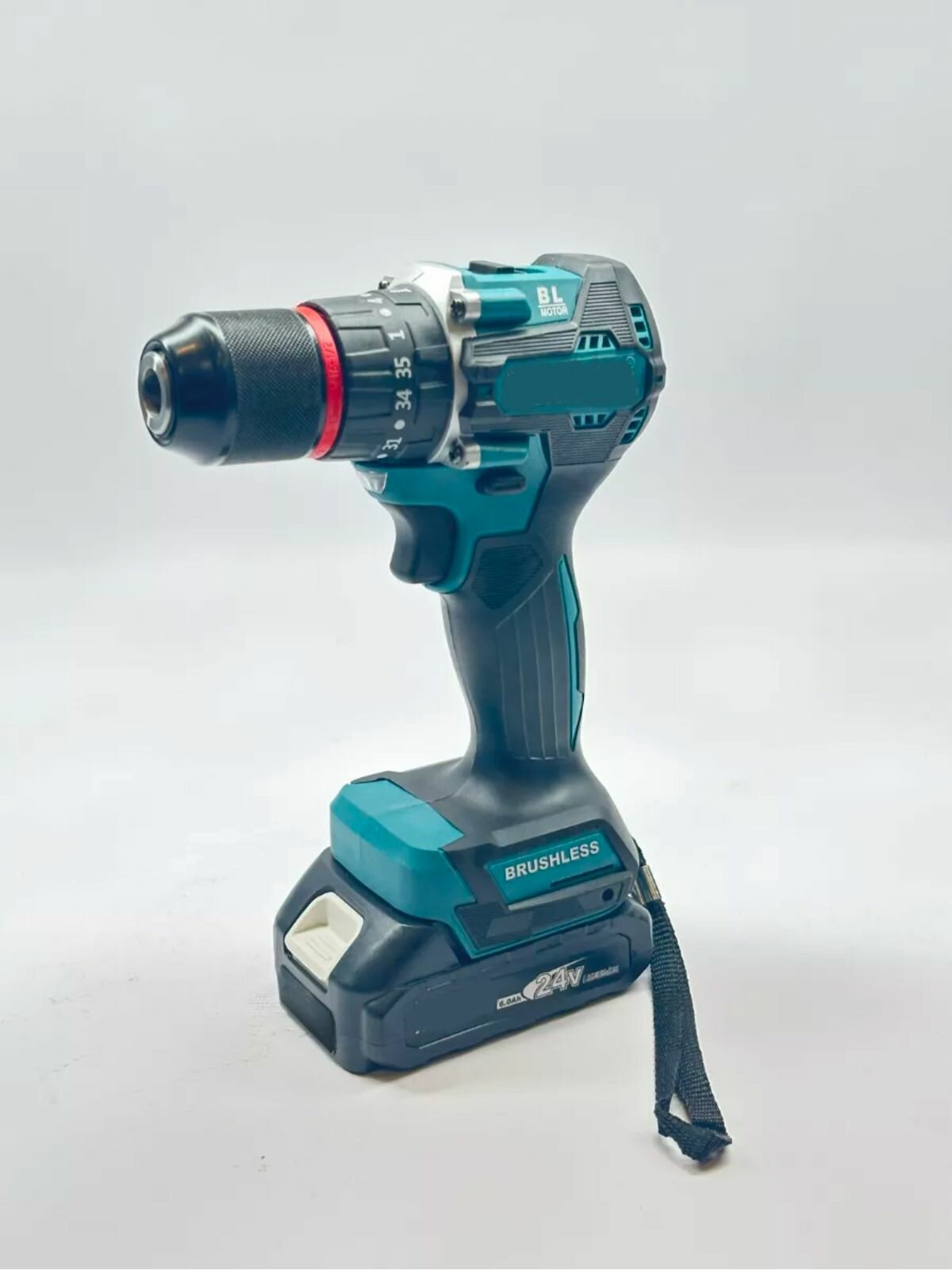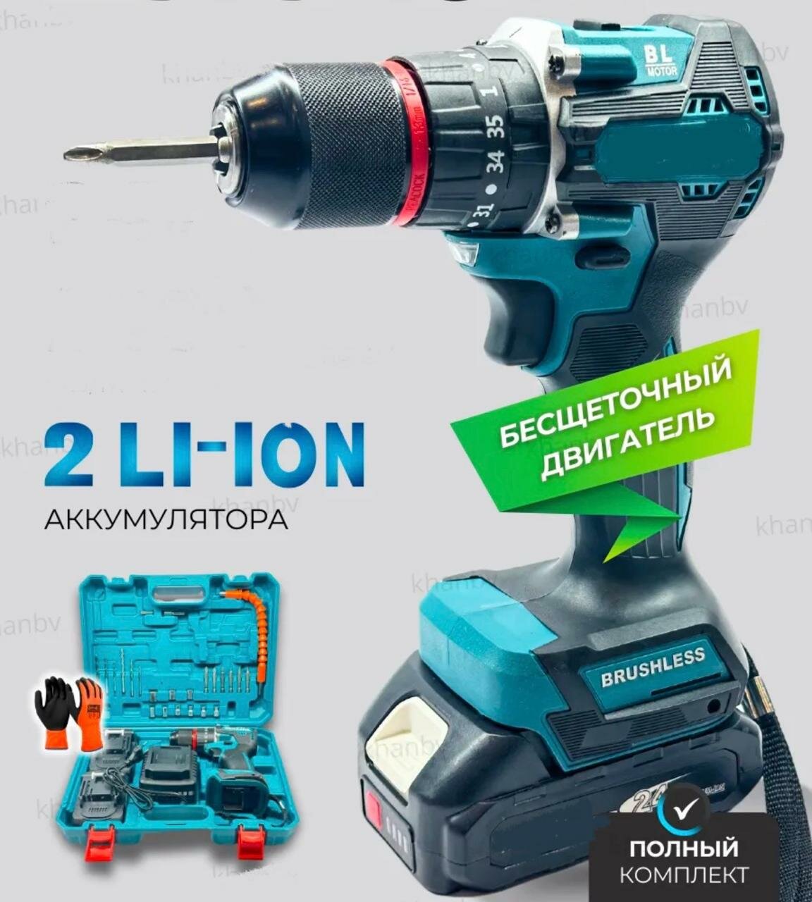 Бесщеточный шуруповерт HIMERS DF24BL аккумуляторный 24V, 2 АКБ по 3 а. ч, 85 Н. м, 13 мм патрон / Кейс с набором бит, свёрел, головок 24 предмета