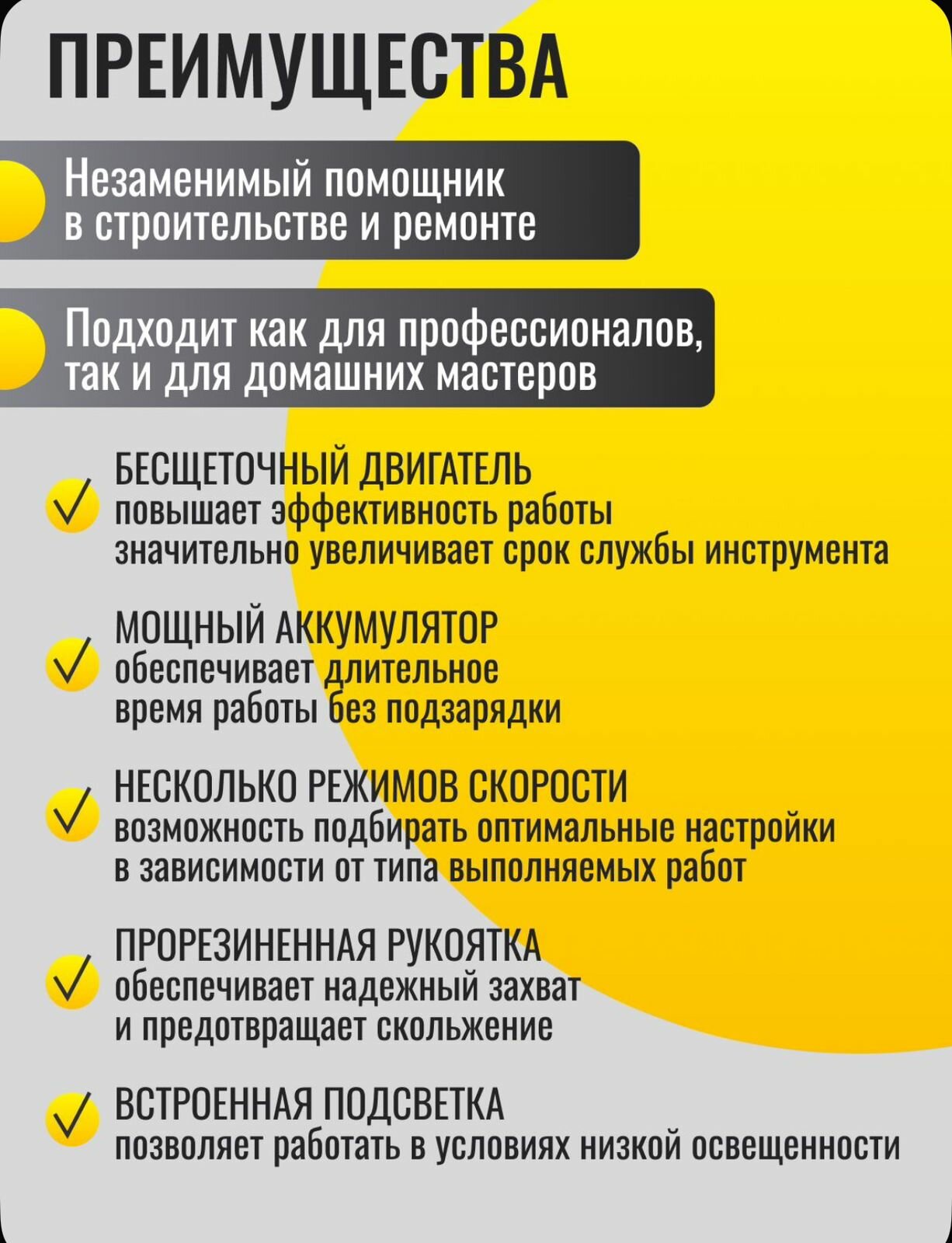 Шуруповерт аккумуляторный бесщеточный набор 18V 2 акб информация: