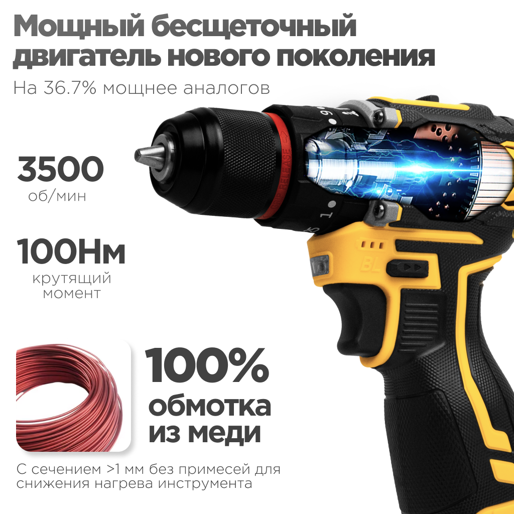 10 цен на Дрель-шуруповерт аккумуляторная Hörder HK-18 Li2 PRO бесщеточный ударный в кейсе, 2 аккумулятора 18 В, 2 Ач 3500 об/мин