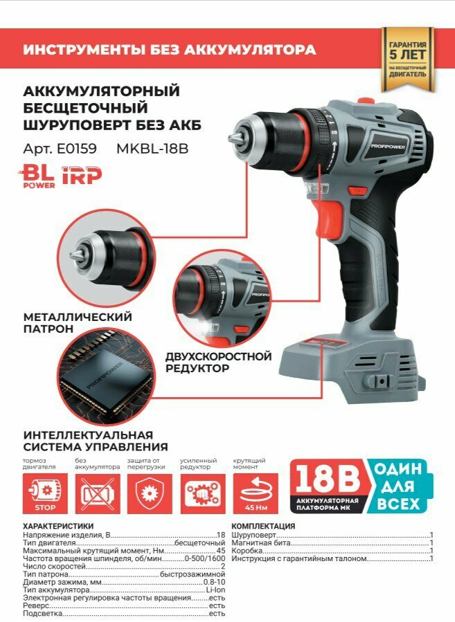 Аккумуляторный бесщеточный шуруповерт без АКБ MKBL-18В ProfiPower информация: