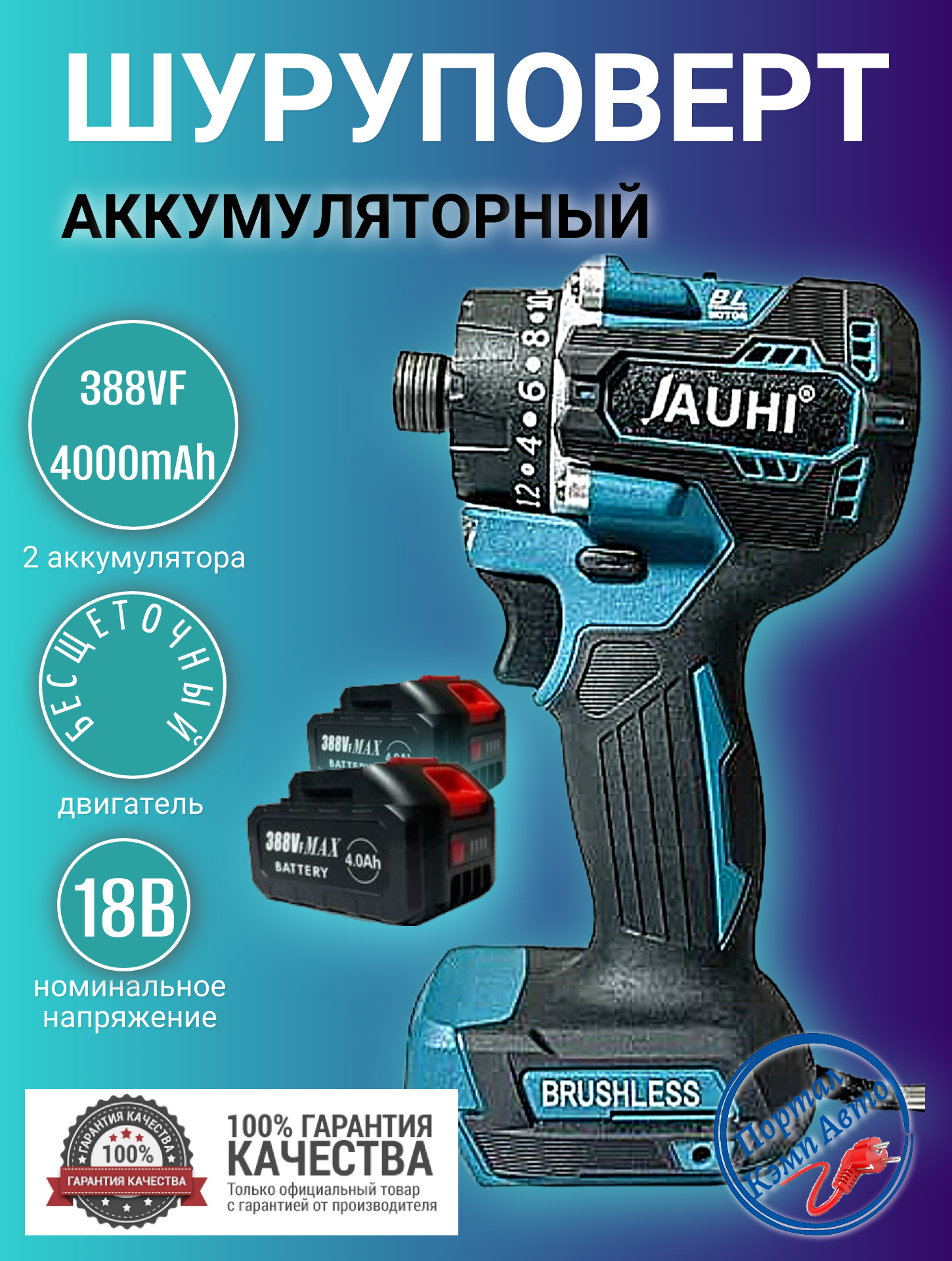 Шуруповерт-отвертка аккумуляторный бесщеточный JAUHI 2700об./мин 20+1,280НМ 18Вт 2 АКБ 388Vf 4000мАч информация: