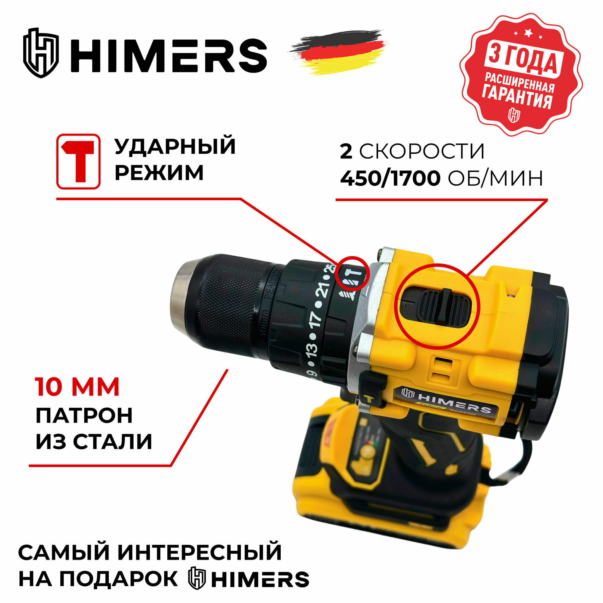 Бесщеточный шуруповерт HIMERS DF75Y-BL с набором 34 предмета 24V, 2 АКБ по 3 А. ч, 75 Н. м, 10мм патрон, Кейс, ударный / Версия Yellow special информация: