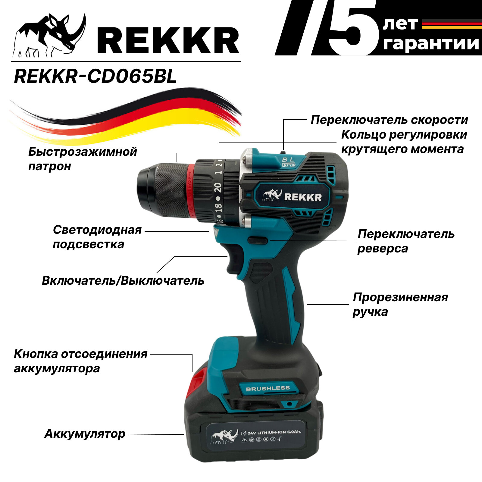 10 цен на Дрель-шуруповерт бесщеточный REKKR CD065BL, 65Нм, 2 аккумулятора 24В 6.0Ач, патрон 10мм, кейс с набором, зарядка