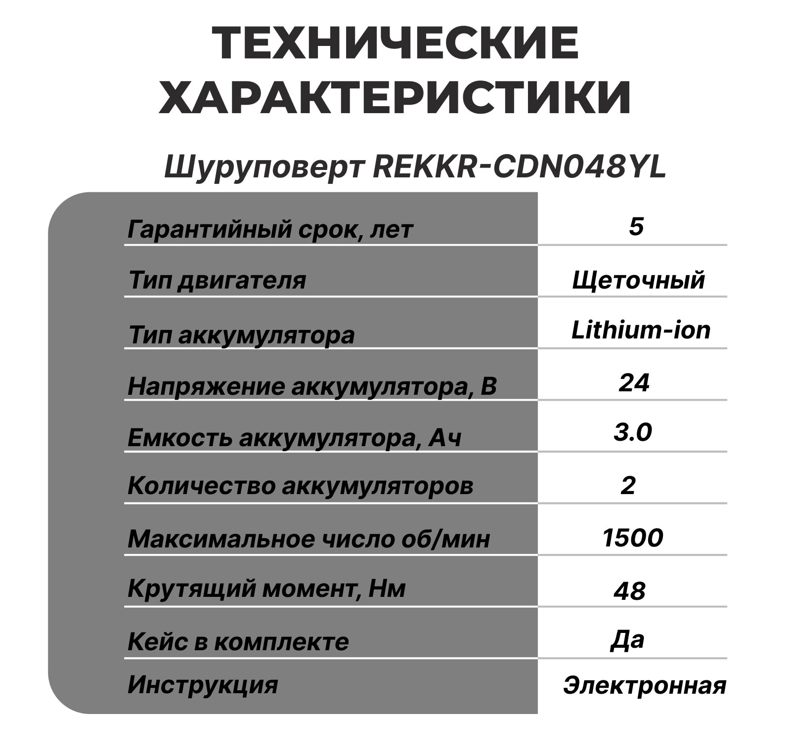 Дрель-шуруповерт аккумуляторный REKKR CDN048YL, 48Нм, 2 аккумулятора 24В 3.0Ач, патрон 10мм, кейс с набором, зарядка информация: