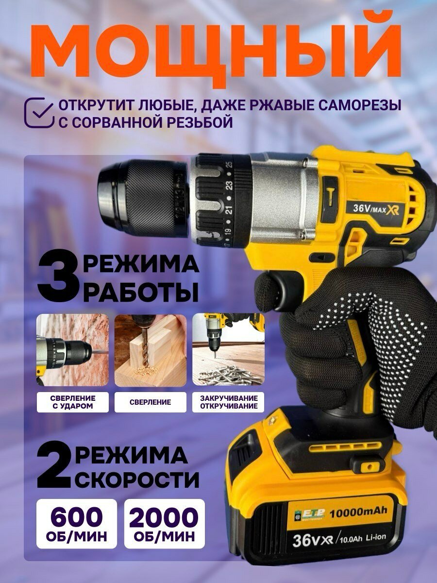 Отзывы на Шуруповерт аккумуляторный 36V ударный с набором инструментов,2 АКБ, Дрель шуруповерт аккумуляторный