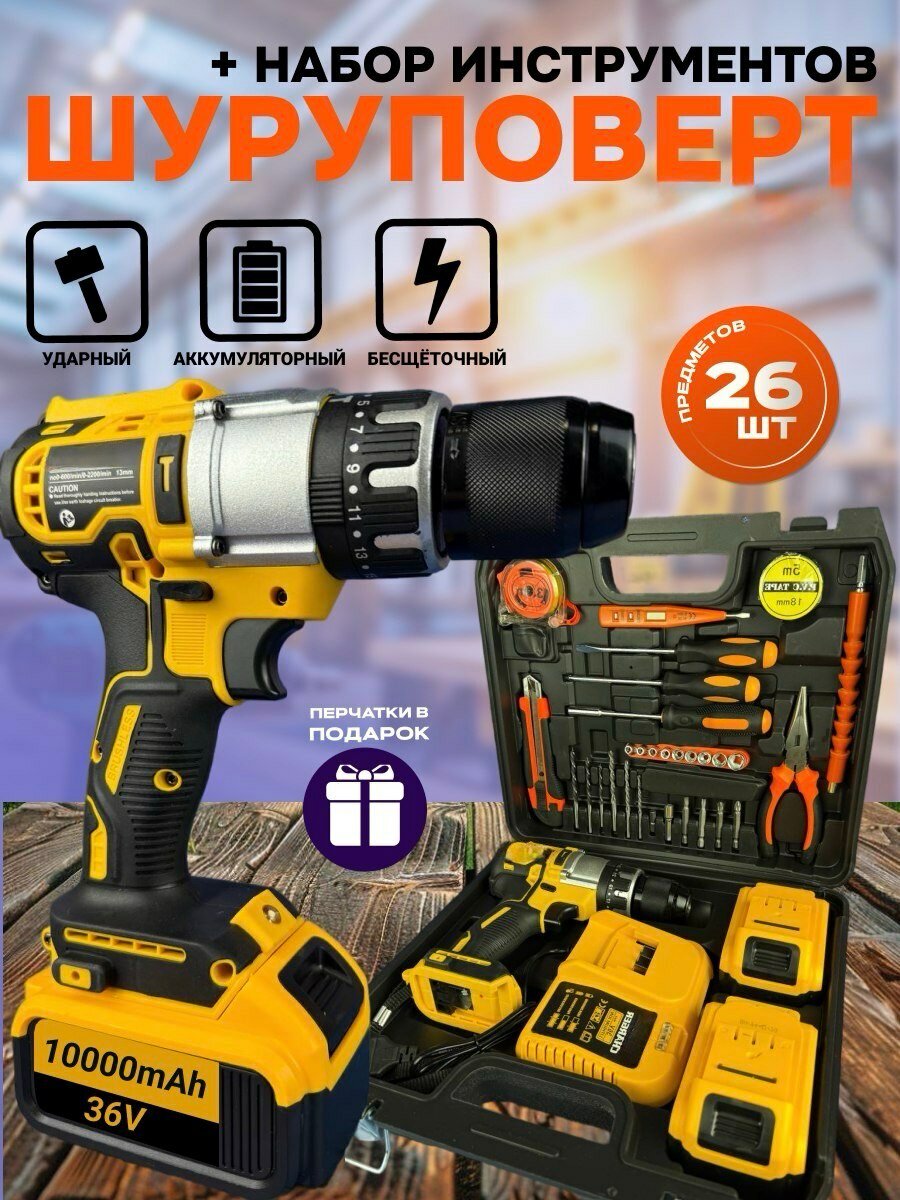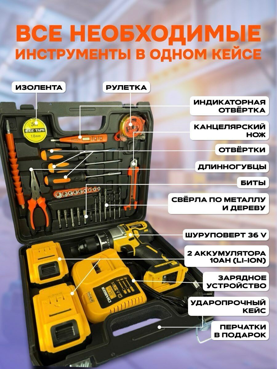 10 цен на Шуруповерт аккумуляторный 36V ударный с набором инструментов,2 АКБ, Дрель шуруповерт аккумуляторный