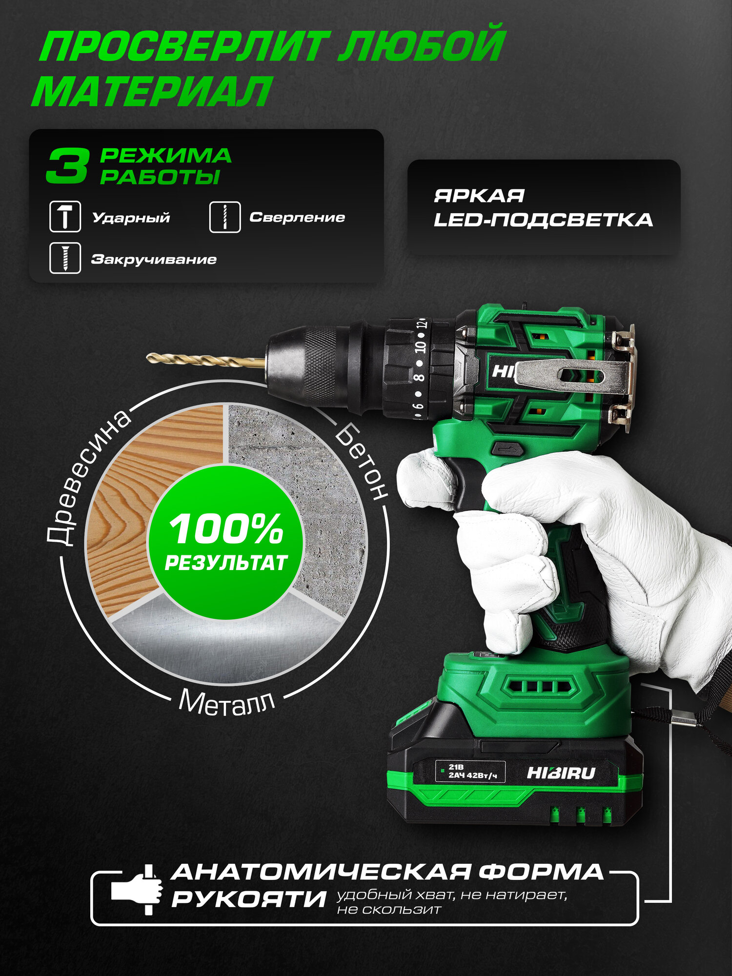 10 цен на Шуруповерт HIBIRU SRW21, бесщеточный, 21В, 60Нм, Li-Ion, 2 Ач