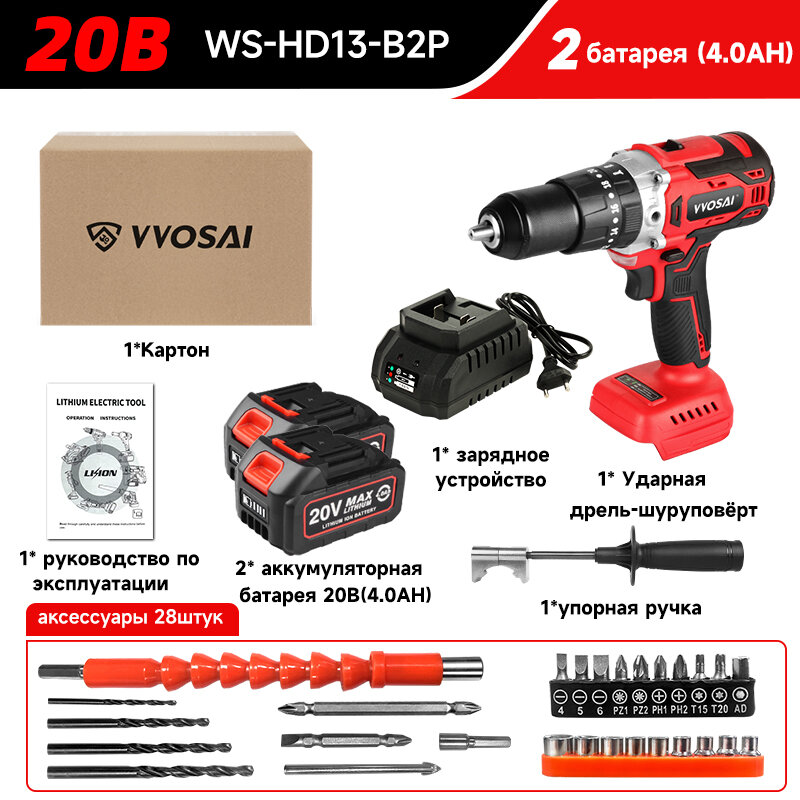 Отзывы на Красная аккумуляторная ударная дрель, бесщеточная, 20 В, 13 мм, 2 аккумулятор 4,0 А·ч