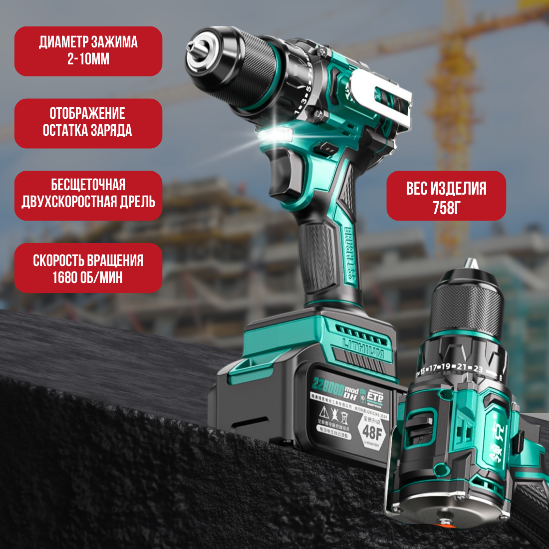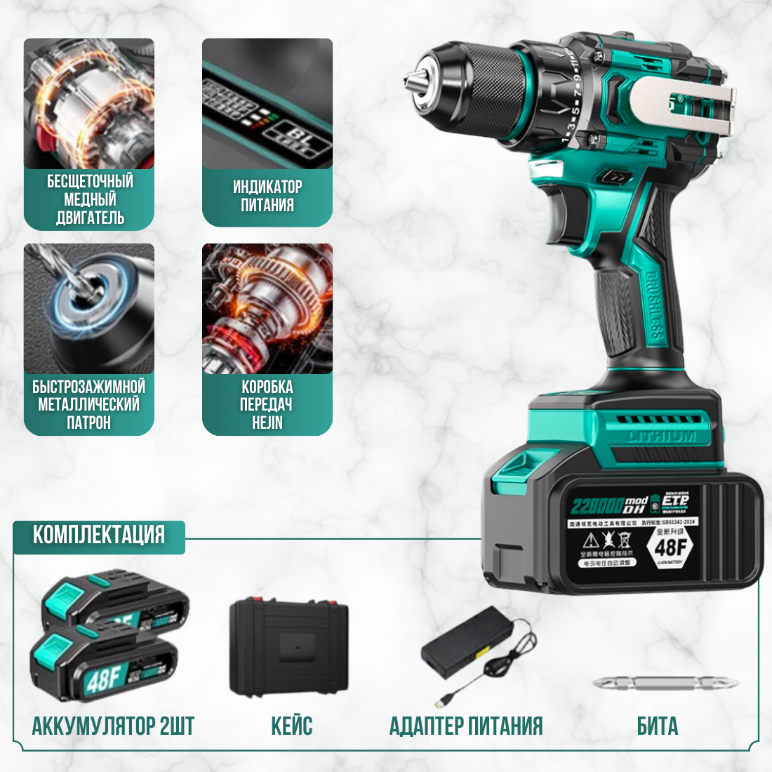 Шуруповёрт аккумуляторный, с ударом, быстрозажимной патрон, Li-ion аккумулятор, 48V