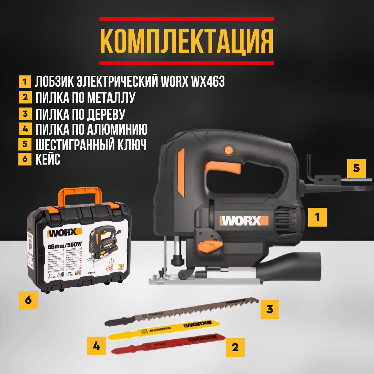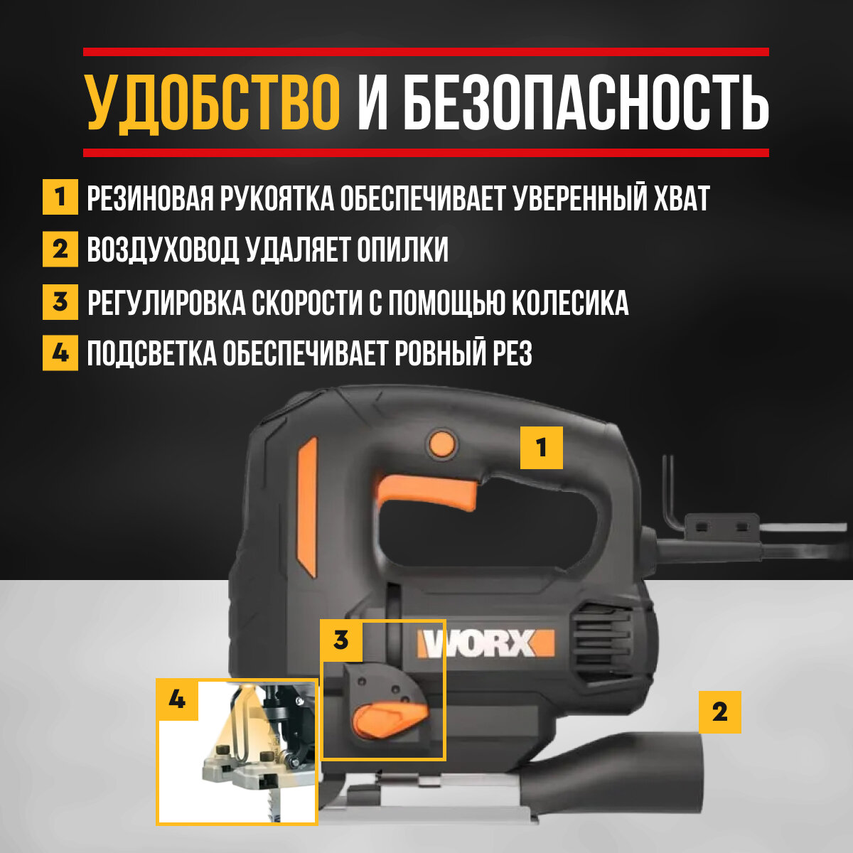Лобзик электрический Worx WX463, обрезиненная ручка, подсветка, в коробке, электролобзик информация: