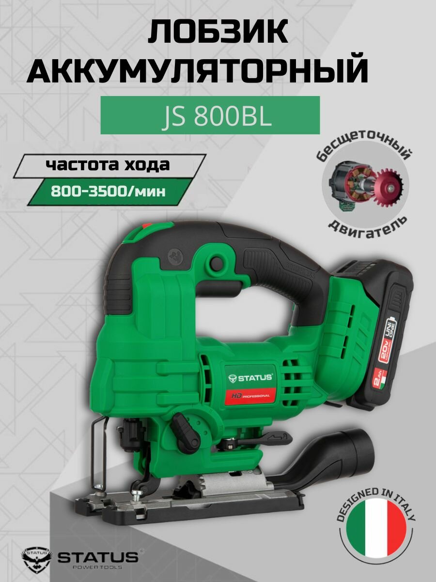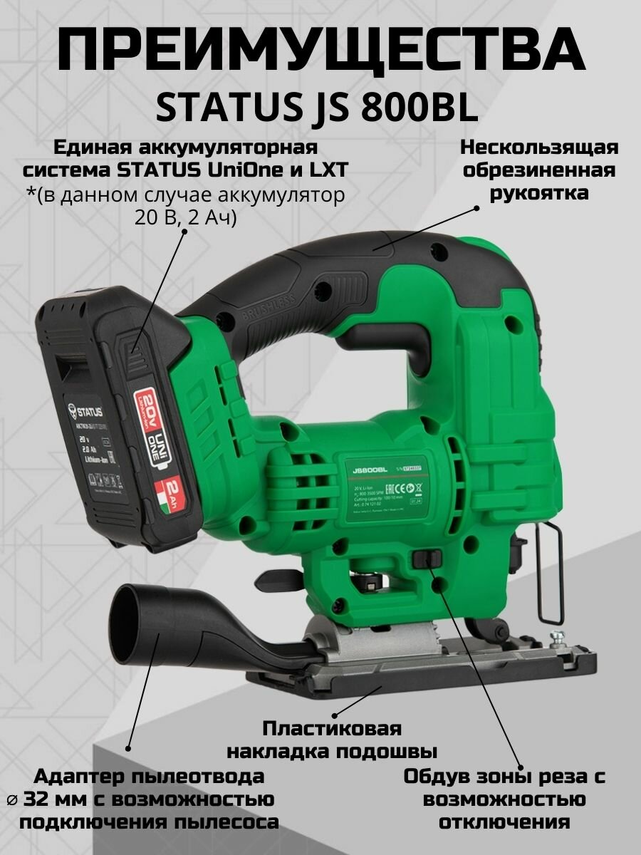 Аккумуляторный лобзик Status JS 800BL, с подсветкой, 20В, 2Ач, 3500 об/мин, 23мм, 1шт информация: