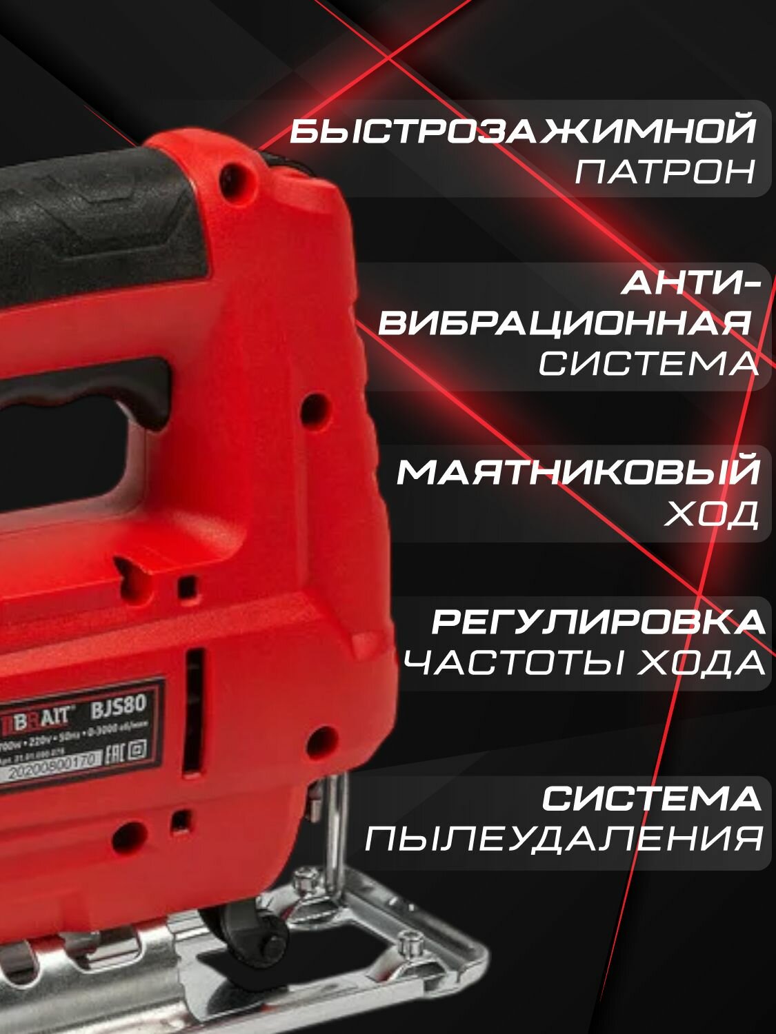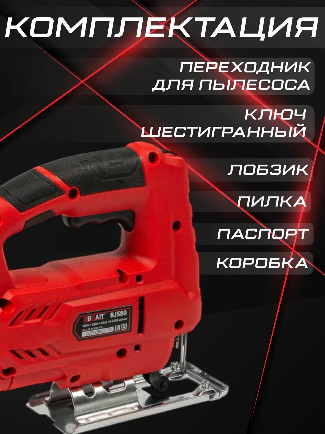 Электрический лобзик BRAIT BJS80, мощность 700 Вт, частота движения пилки ходов/мин 3000, маятниковый ход, электролобзик информация: