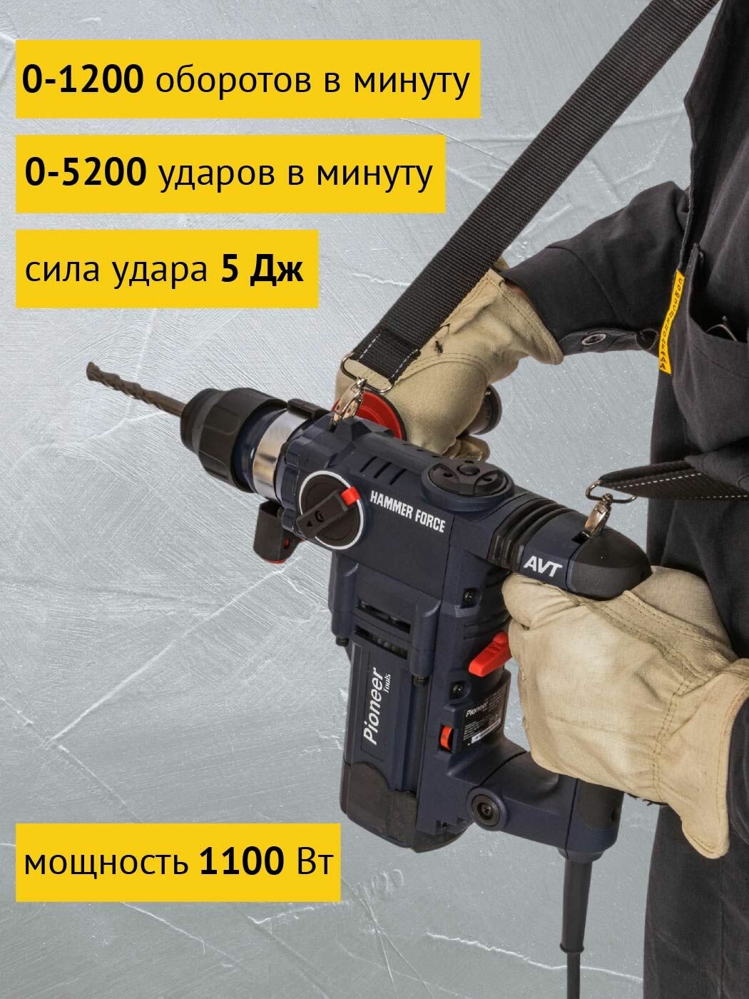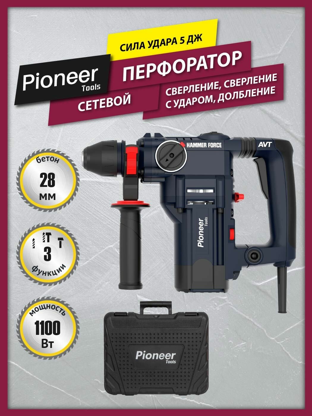 Отзывы на Перфоратор ударный Pioneer RH-E1100V-01C / 1100 Вт, SDS-plus, 5 Дж, 1200 об/мин, 5200 уд/мин, 6 уровней скорости
