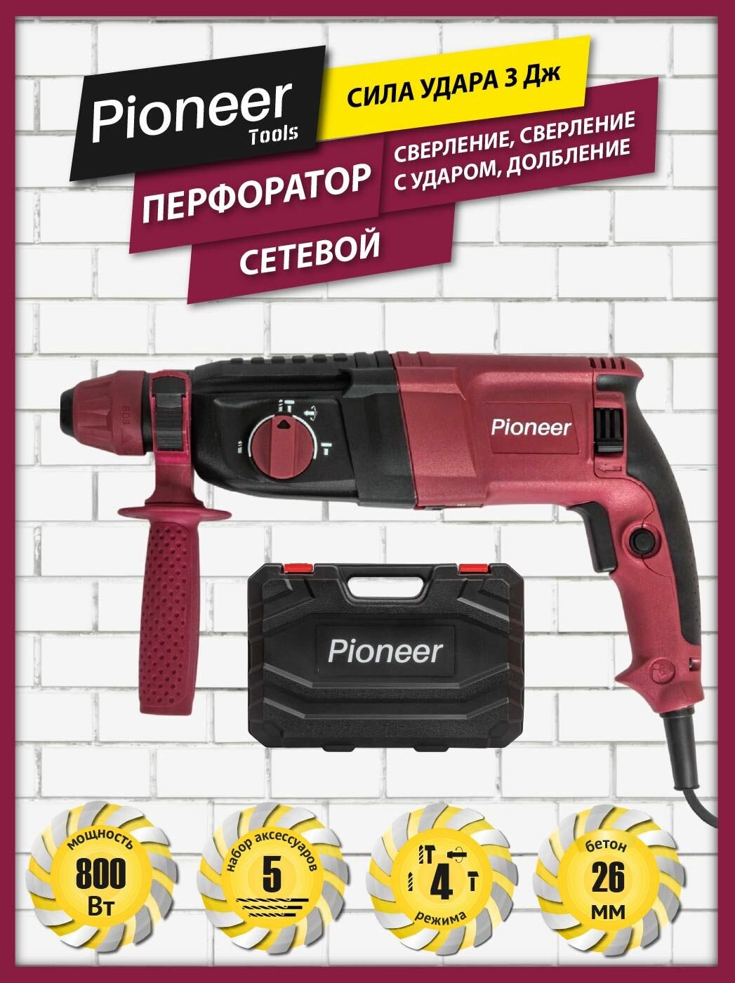10 цен на Перфоратор электрический ударный Pioneer RH-M800-02C / 800 Вт, SDS-plus, 3 Дж, 1200 об/мин, 5300 уд/мин